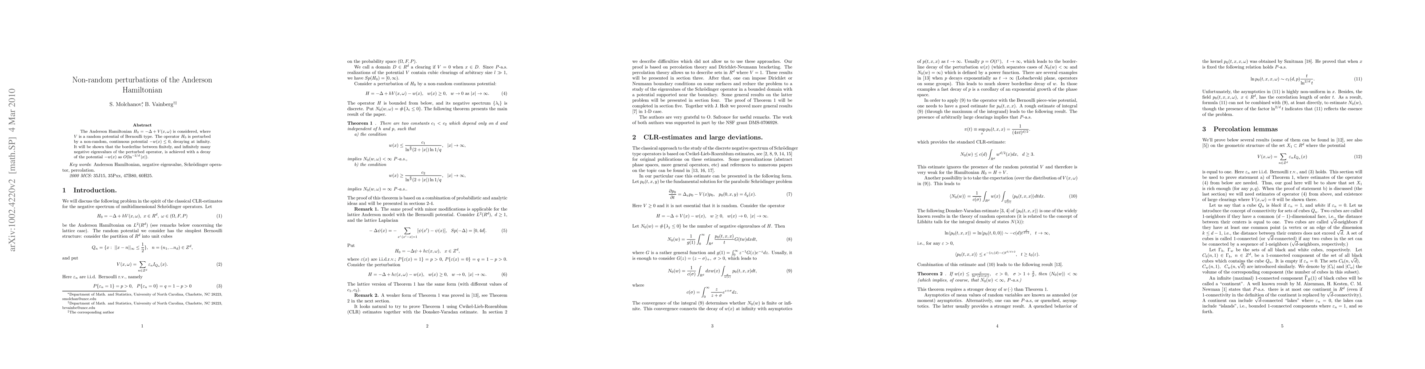 The Anderson Hamiltonian $H_0=-\Delta+V(x,\omega)$ is considered, where $V$ is a random potential of Bernoulli type. The operator $H_0$ is perturbed by a non-random, continuous potential $-w(x) \leq 0$, decaying at infinity. It will be shown that the borderline between finitely, and infinitely many negative eigenvalues of the perturbed operator, is achieved with a decay of the potential $-w(x)$ as $O(\ln^{-2/d} |x|)$.