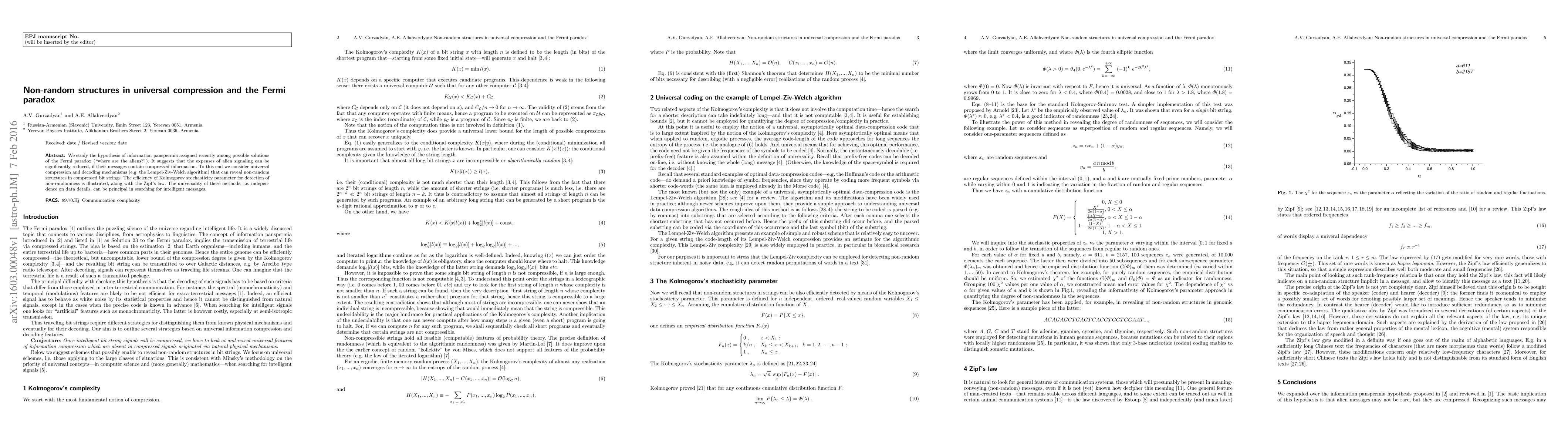 The paper presents a theoretical framework combining Kolmogorov complexity, Lempel-Ziv-Welch algorithm, Kolmogorov stochasticity parameter, and Zipf's law to identify non-random structures in compressed data, potentially applicable to detecting extraterrestrial intelligence.