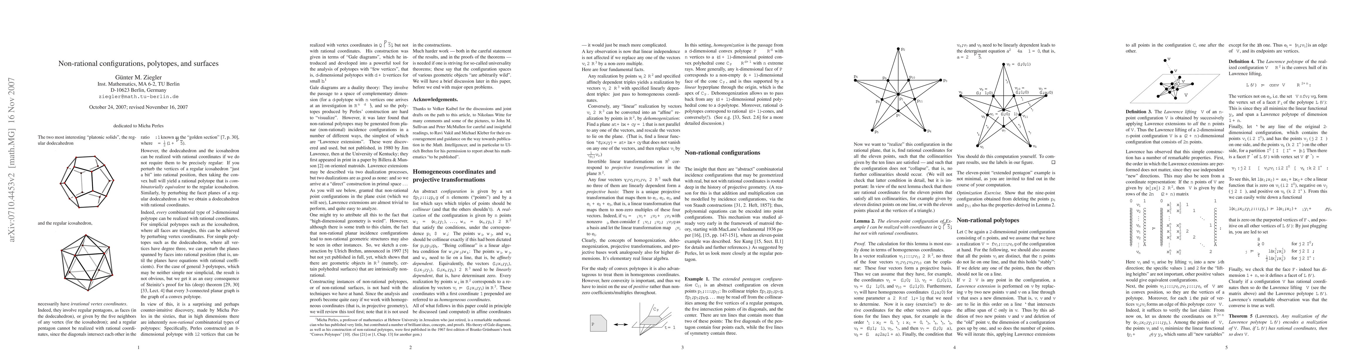 It is an amazing and a bit counter-intuitive discovery by Micha Perles from the sixties that there are ``non-rational polytopes'': combinatorial types of convex polytopes that cannot be realized with rational vertex coordinates. We describe a simple construction of non-rational polytopes that does not need duality (Perles' ``Gale diagrams''): It starts from a non-rational point configuration in the plane, and proceeds with so-called Lawrence extensions. We also show that there are non-rational polyhedral surfaces in 3-space, a discovery by Ulrich Brehm from 1997. His construction also starts from any non-rational point configuration in the plane, and then performs what one should call Brehm extensions, in order to obtain non-rational partial surfaces. These examples and objects are first mile stones on the way to the remarkable "universality theorems'' for polytopes and for polyhedral surfaces by Mn\"ev (1986), Richter-Gebert (1994), and Brehm (1997).