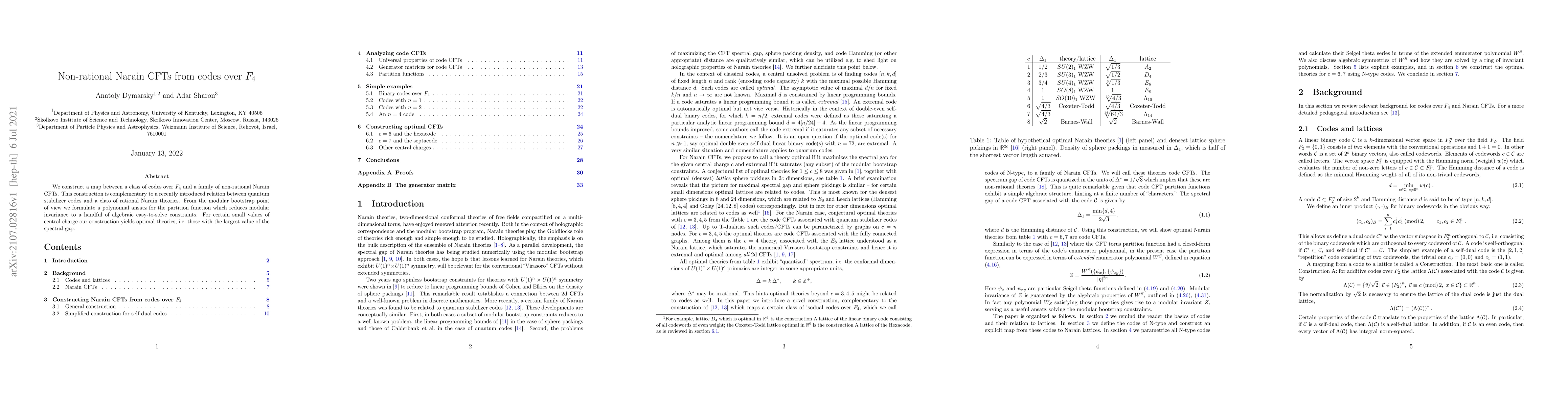 This paper constructs a map between certain $F_4$ codes and non-rational Narain conformal field theories (CFTs), complementing a relation between quantum stabilizer codes and rational Narain theories. It also proposes a polynomial ansatz for partition functions, reducing modular invariance to solvable algebraic constraints, yielding optimal theories for specific central charges.