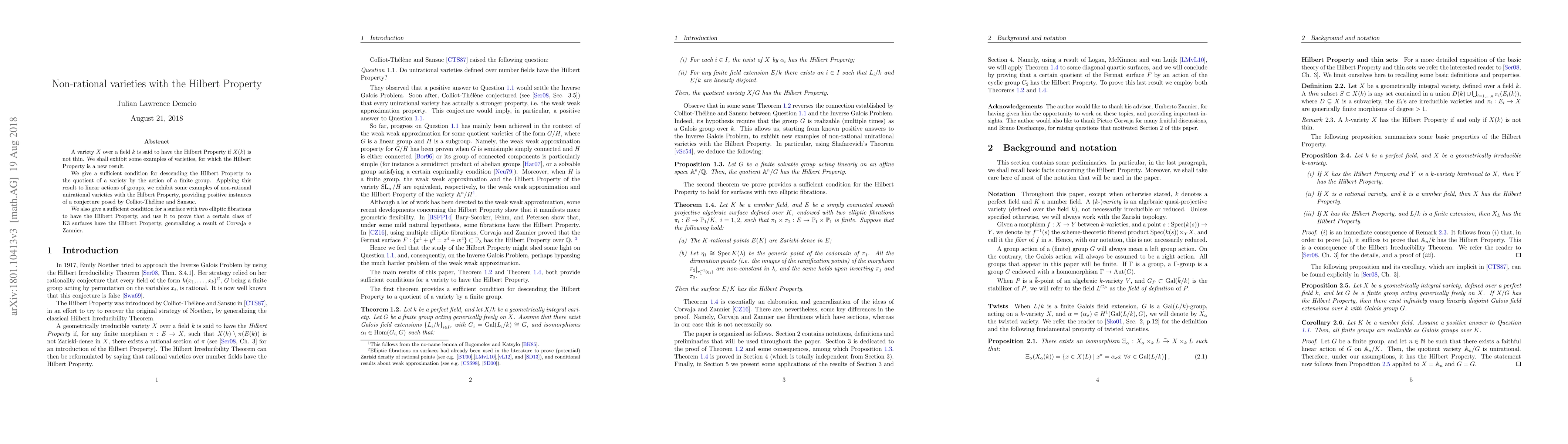 This paper presents new examples of non-rational varieties possessing the Hilbert Property, a condition indicating the presence of a non-thin set of rational points. It provides a criterion for transferring this property from a variety to its quotient under a finite group action, specifically for linear actions, and applies this to K3 surfaces with two elliptic fibrations, notably diagonal quartic surfaces, offering positive examples to a conjecture by Colliot-Thélène and Sansuc.