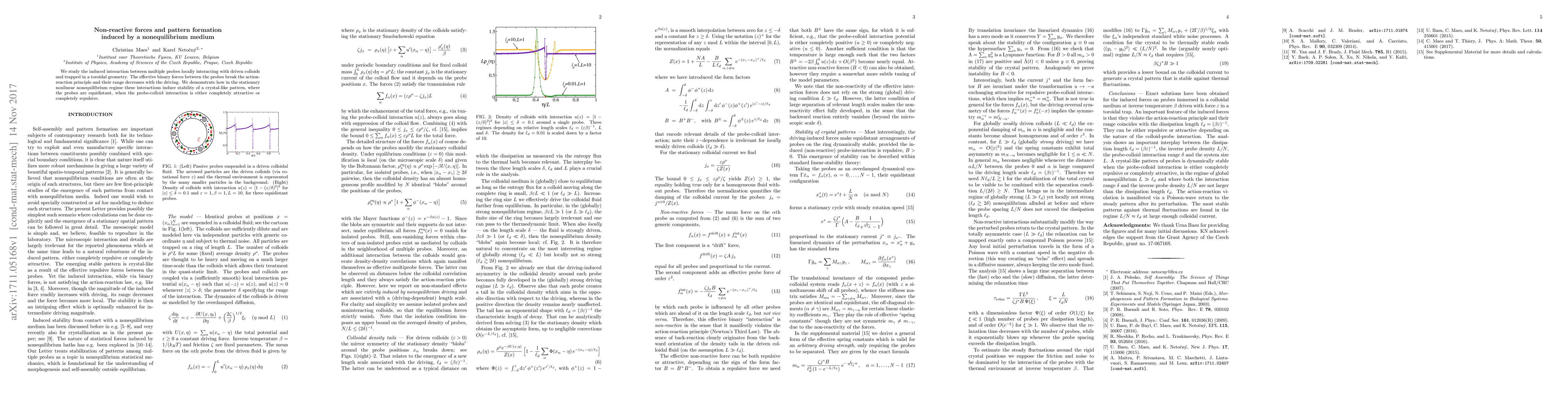 This paper explores how non-reactive forces between probes interacting with driven colloids in a toroidal geometry can induce stable, crystal-like patterns, breaking the action-reaction principle and showing that pattern stability depends on the nature of probe-colloid interactions.