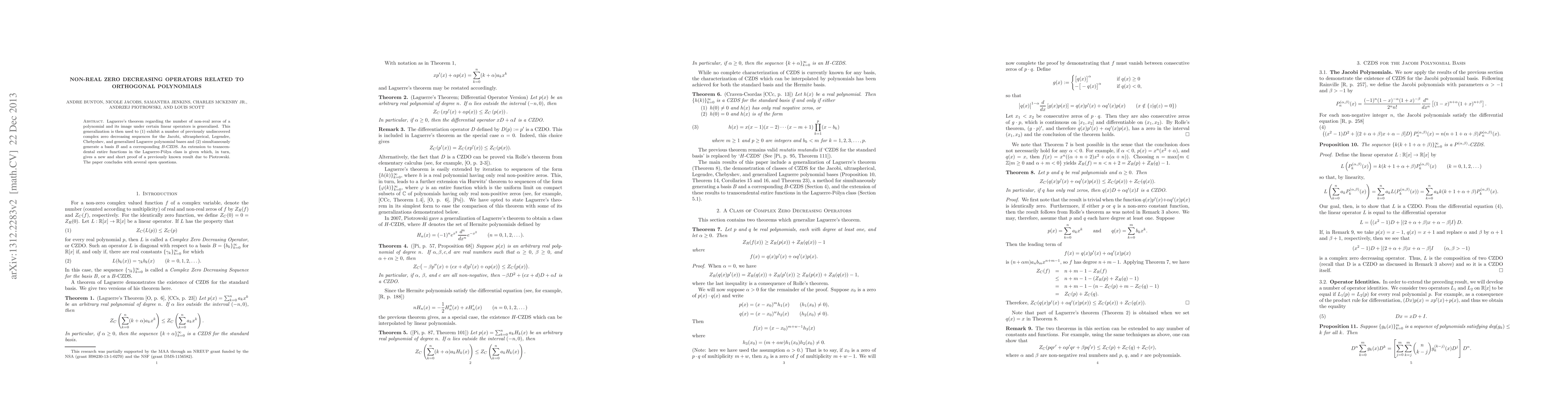 Laguerre's theorem regarding the number of non-real zeros of a polynomial and its image under certain linear operators is generalized. This generalization is then used to (1) exhibit a number of previously undiscovered complex zero decreasing sequences for the Chebyshev, Legendre, and generalized Laguerre polynomial bases and (2) simultaneously generate a basis $B$ and a corresponding $B$-CZDS. Some extensions to transcendental entire functions in the Laguerre-Polya class are given which, in turn, give a new and short proof of a previously known result due to one of the authors. The paper concludes with several open questions.