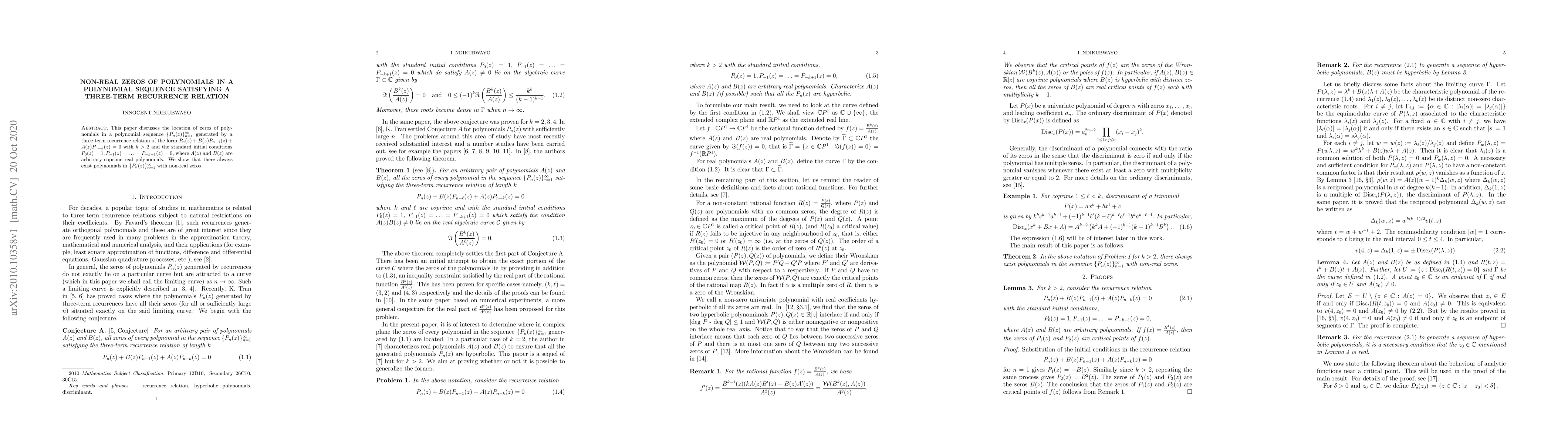 A research paper shows that polynomials in a sequence generated by a three-term recurrence relation can have non-real zeros, implying the existence of complex roots in certain polynomial sequences.