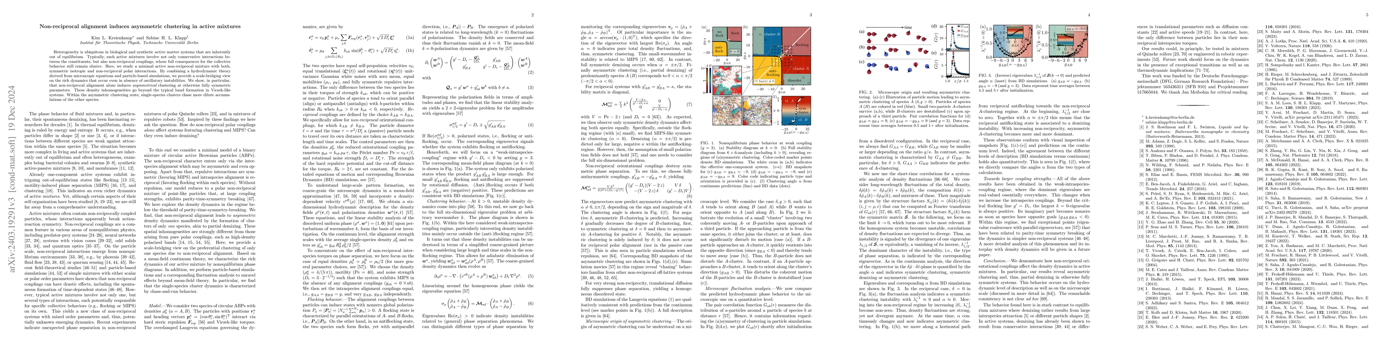 Research demonstrates that non-reciprocal alignment interactions in active mixtures lead to asymmetric clustering and partial demixing, with single-species clusters following more dilute species, ultimately causing the disappearance of clustered states under high alignment. This effect is shown through a combination of hydrodynamic theory, simulations, and fluctuation analysis.