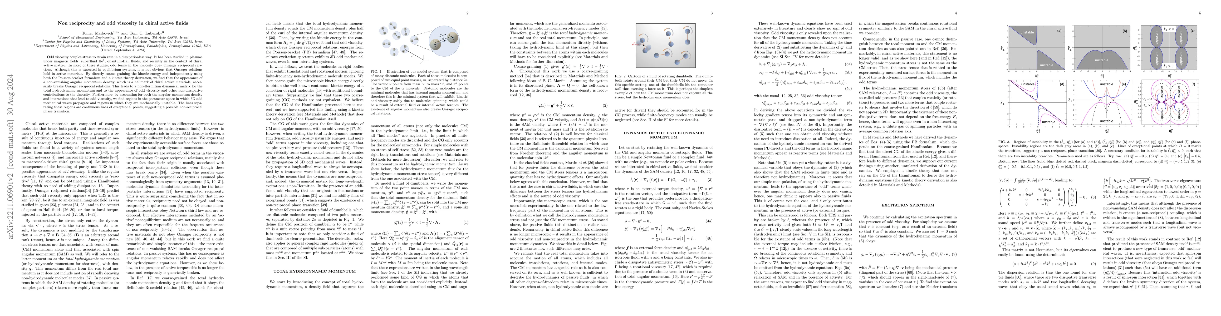 Odd viscosity couples stress to strain rate in a dissipationless way. It has been studied in plasmas under magnetic fields, superfluid ${\rm He}^3$, quantum Hall fluids, and recently in the context of chiral active matter. In most of these studies odd terms in the viscosity obey Onsager reciprocal relations. Although this is expected in equilibrium systems, it is not obvious that Onsager relations hold in active materials. By directly coarse graining the kinetic energy and using both the Poisson-bracket formalism and a kinetic theory derivation, we find that the appearance of a non-vanishing angular momentum density necessarily breaks Onsager reciprocal relations, which leads to a non-Hermitian dynamical matrix for the total momentum and to the appearance of odd viscosity and other non-dissipative contributions to the viscosity. Furthermore, by accounting for both the angular momentum density and interactions that lead to odd viscosity, we find regions in the parameter space in which 3D odd mechanical waves propagate and and regions in which they are mechanically unstable. The lines separating these regions are continuous lines of exceptional points, suggesting of a non-reciprocal phase transition.