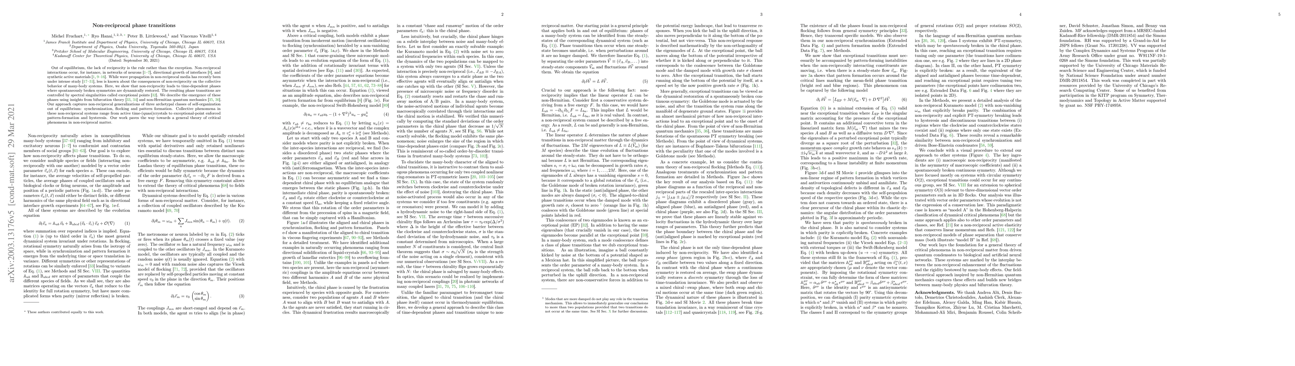 This paper explores how non-reciprocity in out-of-equilibrium systems leads to dynamic phase transitions with spontaneously broken symmetries, governed by exceptional points. It generalizes self-organization phenomena like synchronization and flocking to non-reciprocal systems, paving the way for a broader theory of critical phenomena in non-reciprocal matter.
