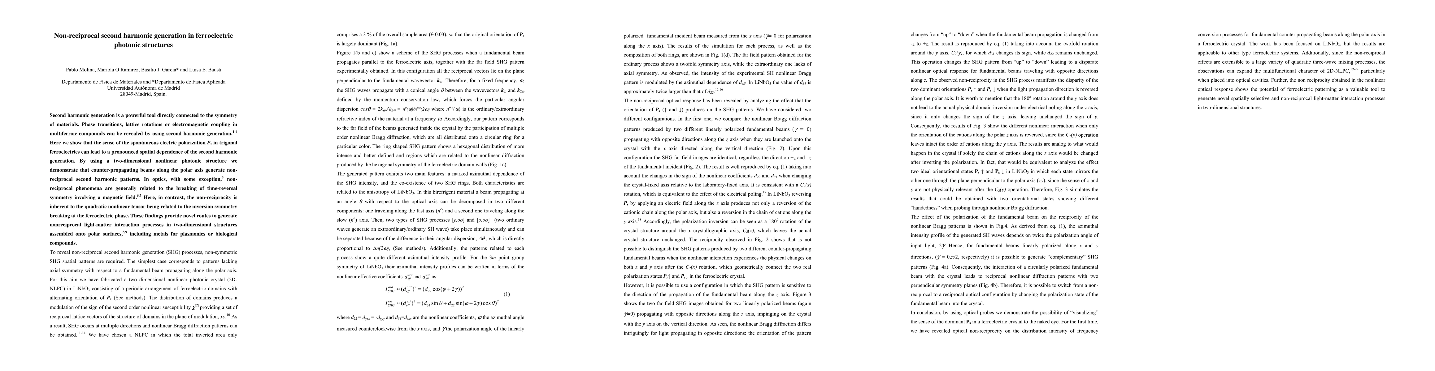 Second harmonic generation is a powerful tool directly connected to the symmetry of materials. Phase transitions, lattice rotations or electromagnetic coupling in multiferroic compounds can be revealed by using second harmonic generation.[1-4] Here we show that the sense of the spontaneous electric polarization Ps in trigonal ferroelectrics can lead to a pronounced spatial dependence of the second harmonic generation. By using a two-dimensional nonlinear photonic structure we demonstrate that counter-propagating beams along the polar axis generate non-reciprocal second harmonic patterns. In optics, with some exception,[5] non-reciprocal phenomena are generally related to the breaking of time-reversal symmetry involving a magnetic field.[6,7] Here, in contrast, the non-reciprocity is inherent to the quadratic nonlinear tensor being related to the inversion symmetry breaking at the ferroelectric phase. These findings provide novel routes to generate nonreciprocal light-matter interaction processes in two-dimensional structures assembled onto polar surfaces,[8,9] including metals for plasmonics or biological compounds.
