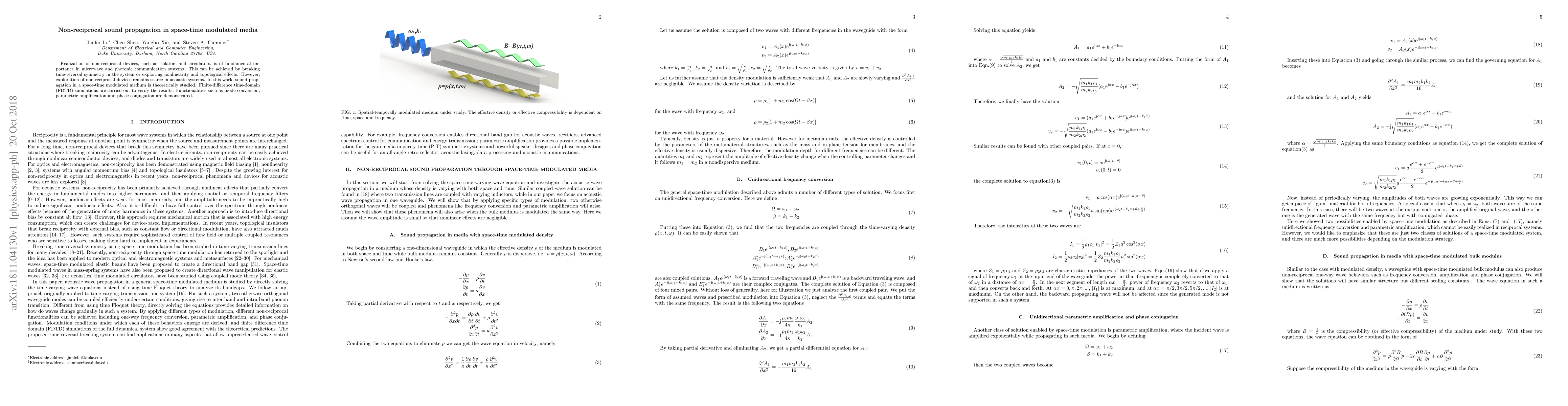 This paper theoretically investigates non-reciprocal sound propagation in space-time modulated media, demonstrating functionalities like mode conversion and parametric amplification through FDTD simulations, expanding the potential for acoustic isolators and circulators.