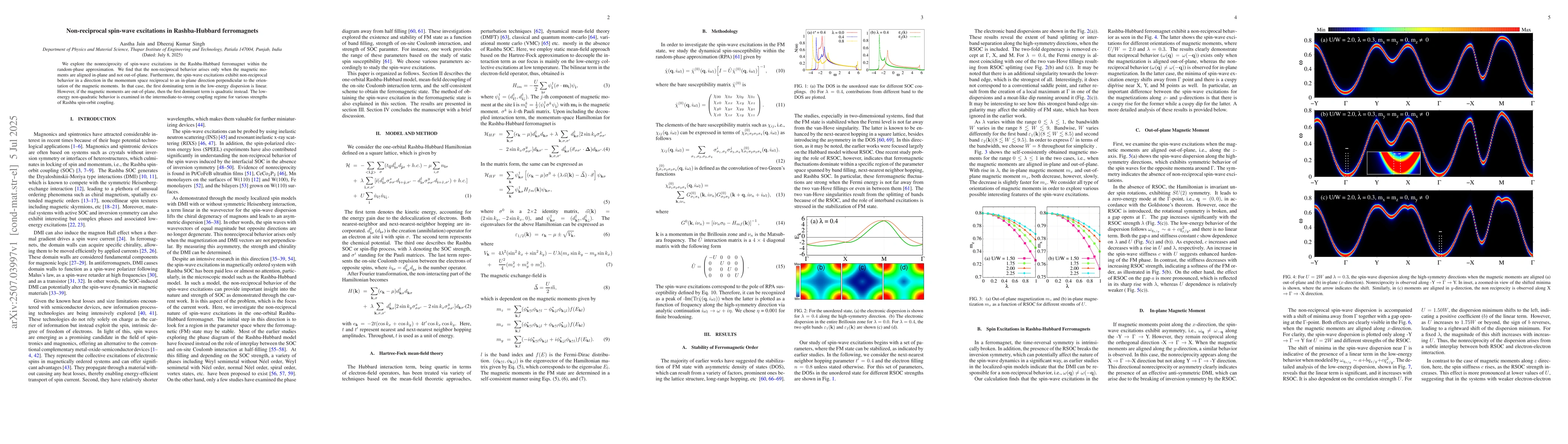 We explore the nonreciprocity of spin-wave excitations in the Rashba-Hubbard ferromagnet within the random-phase approximation. We find that the non-reciprocal behavior arises only when the magnetic moments are aligned in-plane and not out-of-plane. Furthermore, the spin-wave excitations exhibit non-reciprocal behavior in a direction in the momentum space reciprocal to an in-plane direction perpendicular to the orientation of the magnetic moments. In that case, the first dominating term in the low-energy dispersion is linear. However, if the magnetic moments are out-of-plane, then the first dominant term is quadratic instead. The low-energy non-quadratic behavior is examined in the intermediate-to-strong coupling regime for various strengths of Rashba spin-orbit coupling.