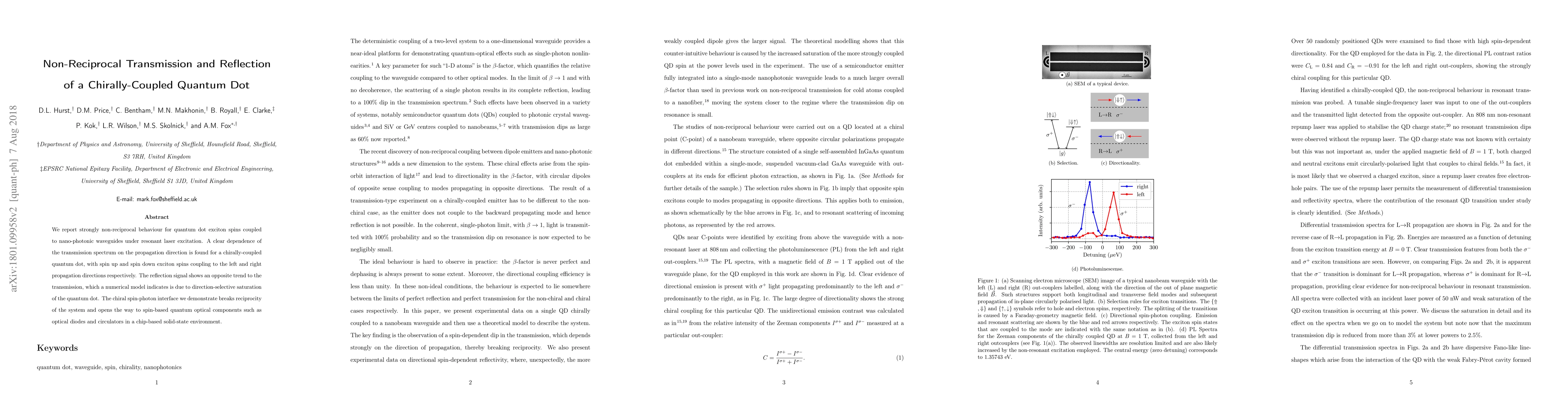 This paper reports strongly non-reciprocal transmission and reflection in a chirally-coupled quantum dot under resonant laser excitation, demonstrating direction-dependent exciton spin coupling and breaking reciprocity. This chiral spin-photon interface paves the way for spin-based quantum optical components like optical diodes and circulators.