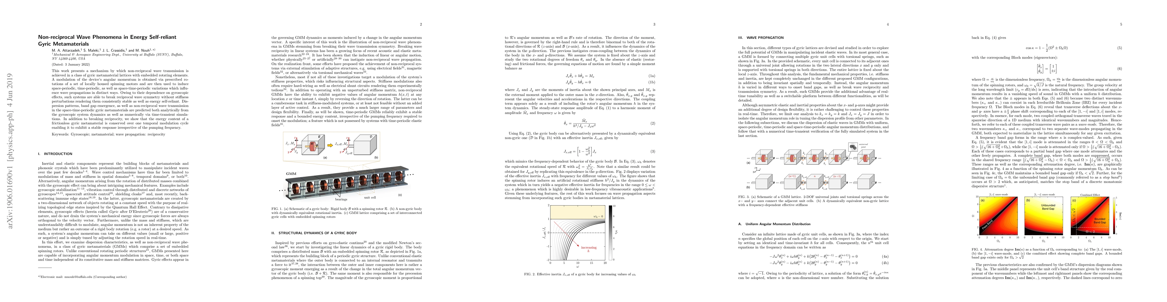 This research develops gyric metamaterials with rotating elements to achieve non-reciprocal wave transmission, conserving energy without stiffness changes. Analytical and numerical simulations predict dispersion patterns, band gaps, and stable non-reciprocal wave behavior in these systems.