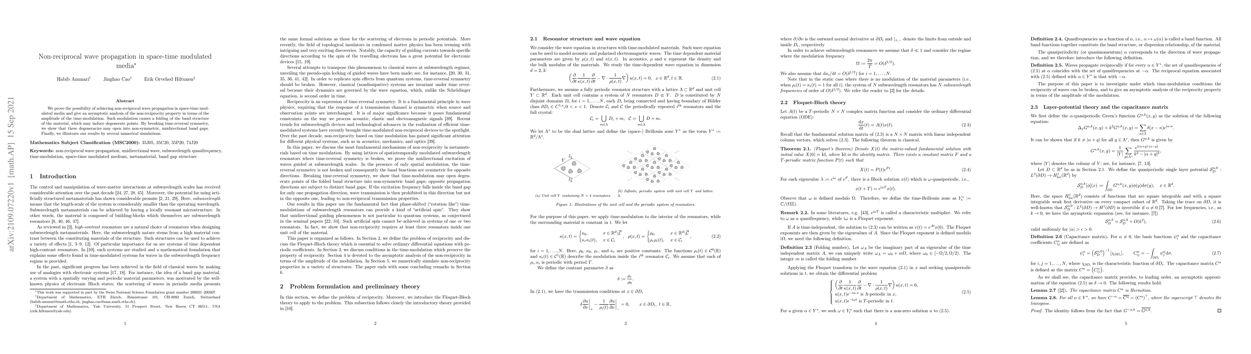 We prove the possibility of achieving non-reciprocal wave propagation in space-time modulated media and give an asymptotic analysis of the non-reciprocity property in terms of the amplitude of the time-modulation. Such modulation causes a folding of the band structure of the material, which may induce degenerate points. By breaking time-reversal symmetry, we show that these degeneracies may open into non-symmetric, unidirectional band gaps. Finally we illustrate our results by several numerical simulations.