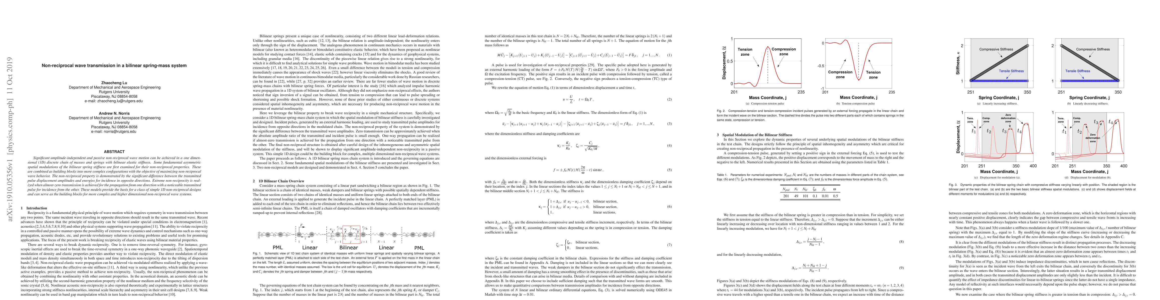 The research presents a unique approach to non-reciprocity by leveraging bilinear elastic stiffness and asymmetric spatial modulations, offering a simple yet effective design for non-reciprocal wave control.