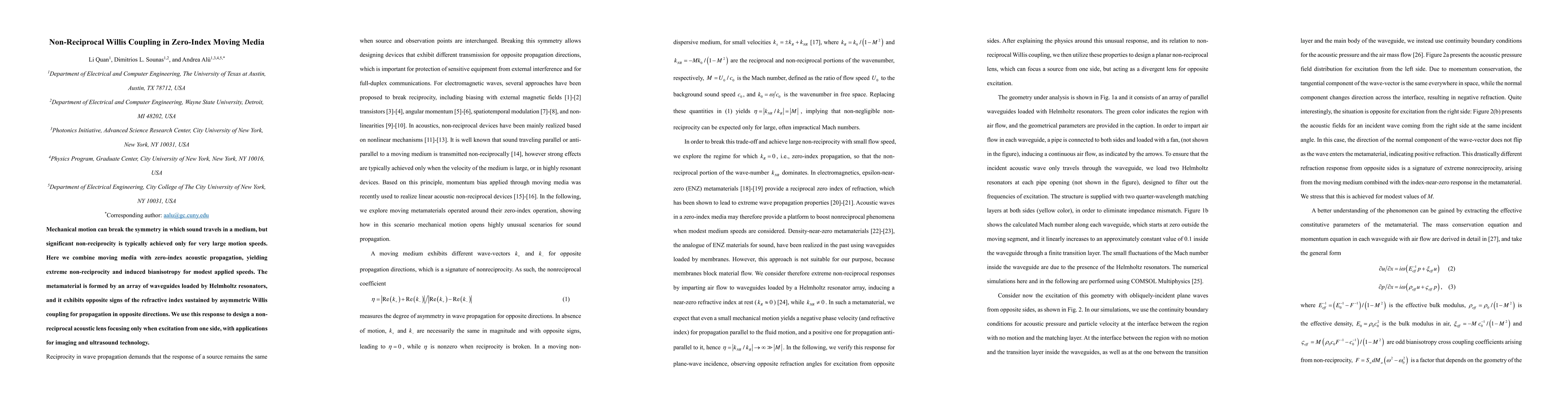 This paper presents a metamaterial combining zero-index acoustic propagation and moving media to achieve significant non-reciprocity at modest speeds, enabling a non-reciprocal acoustic lens for focused ultrasound applications. The design utilizes waveguides with Helmholtz resonators to create asymmetric Willis coupling.