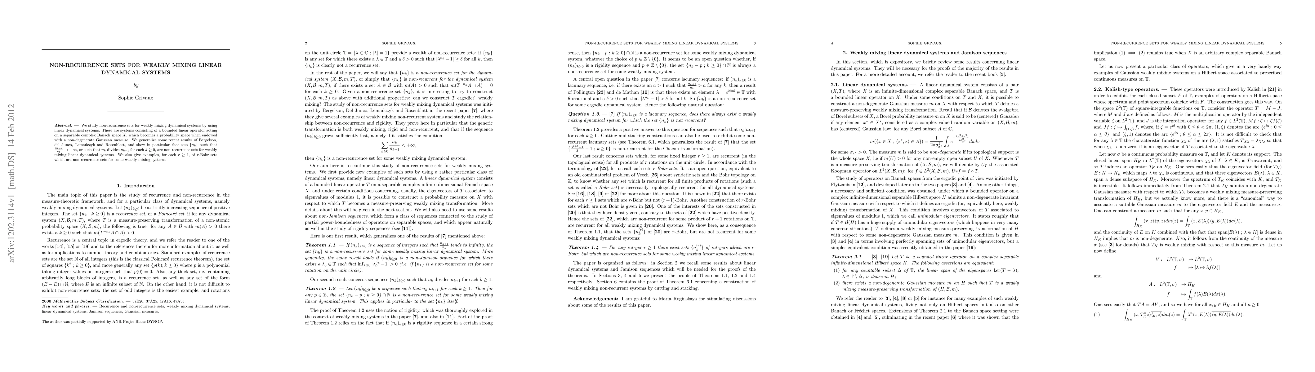 We study non-recurrence sets for weakly mixing dynamical systems by using linear dynamical systems. These are systems consisting of a bounded linear operator acting on a separable complex Banach space X, which becomes a probability space when endowed with a non-degenerate Gaussian measure. We generalize some recent results of Bergelson, del Junco, Lema\'nczyk and Rosenblatt, and show in particular that sets \{n_k\} such that n_{k+1}/{n_k} tends to infinity, or such that n_{k} divides n_{k+1} for each k, are non-recurrence sets for weakly mixing linear dynamical systems. We also give examples, for each r, of r-Bohr sets which are non-recurrence sets for some weakly mixing systems.