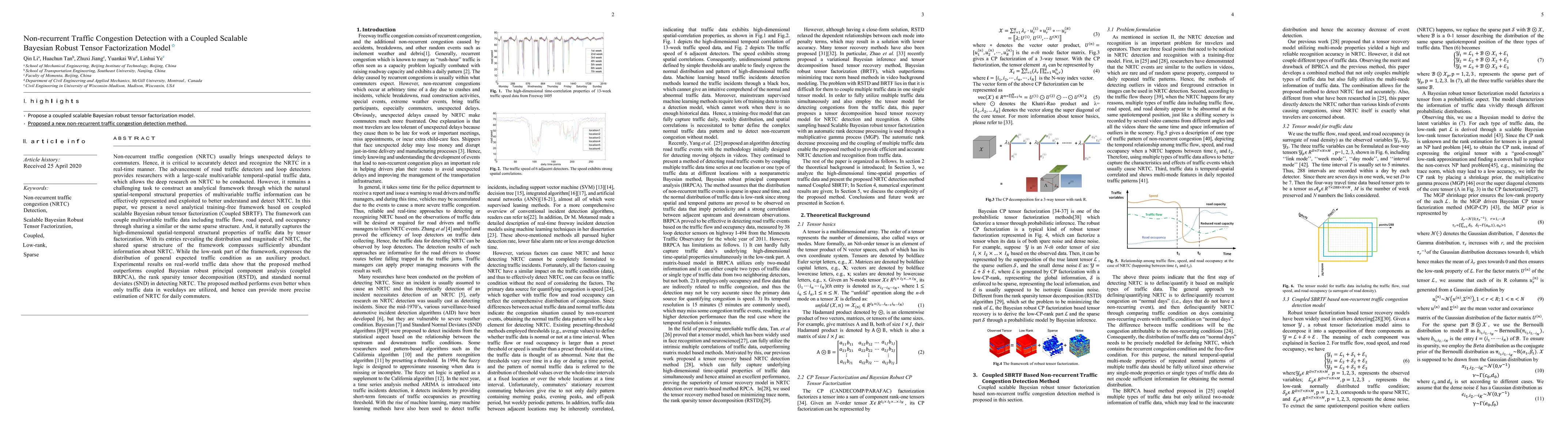This paper introduces a novel Coupled Scalable Bayesian Robust Tensor Factorization (Coupled SBRTF) model for detecting non-recurrent traffic congestion (NRTC) in real-time. The framework effectively represents and exploits the spatial-temporal properties of multivariable traffic data, outperforming existing methods in NRTC detection, especially using weekday data for more precise daily commuter estimations.