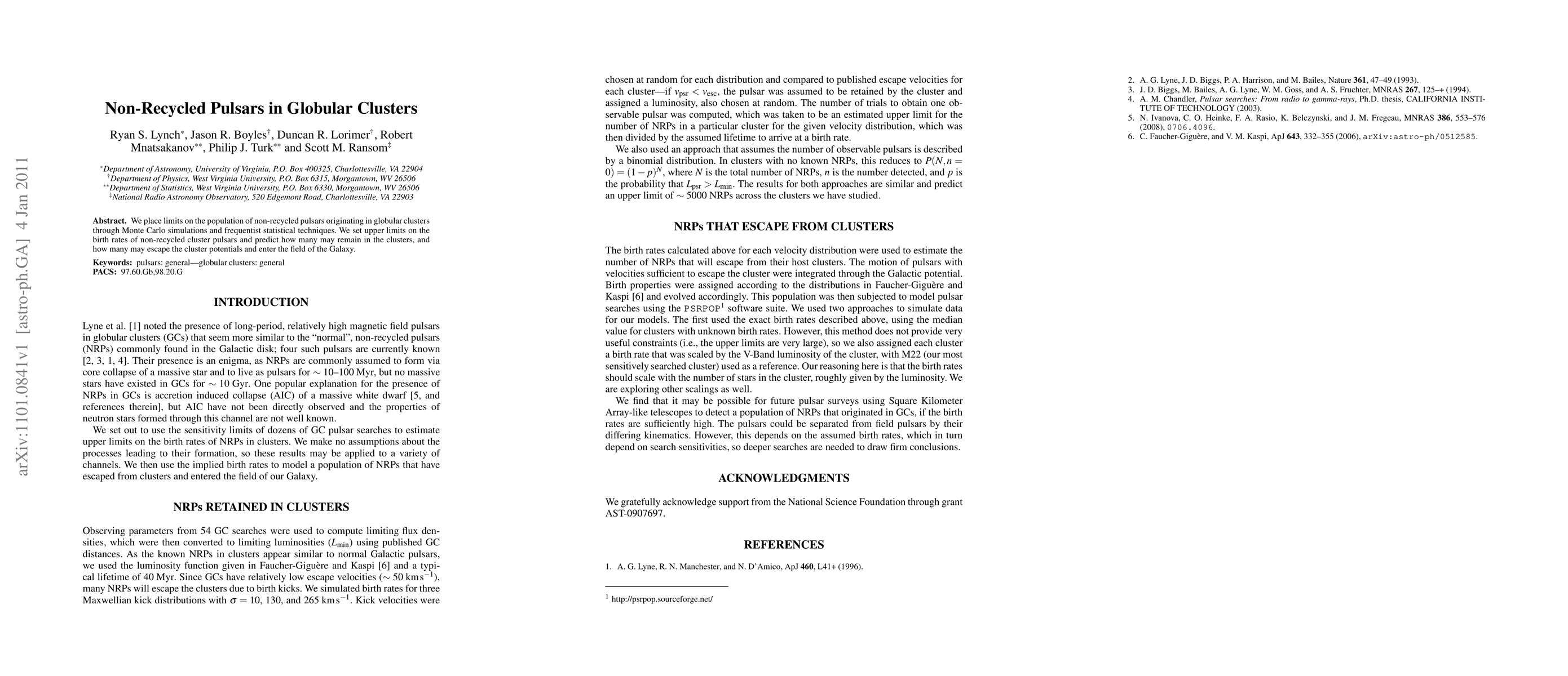 Developed a method to estimate upper limits on the birth rates of non-recycled pulsars in globular clusters using Monte Carlo simulations and frequentist statistical techniques