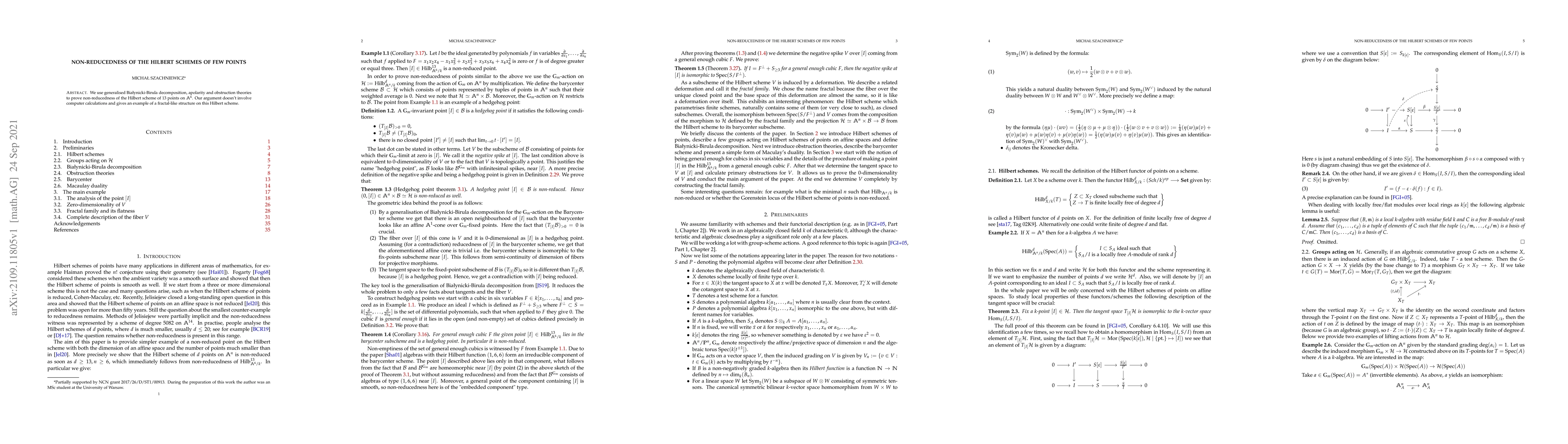 We use generalised Bialynicki-Birula decomposition, apolarity and obstruction theories to prove non-reducedness of the Hilbert scheme of $13$ points on $\mathbb{A}^6$. Our argument doesn't involve computer calculations and gives an example of a fractal-like structure on this Hilbert scheme.
