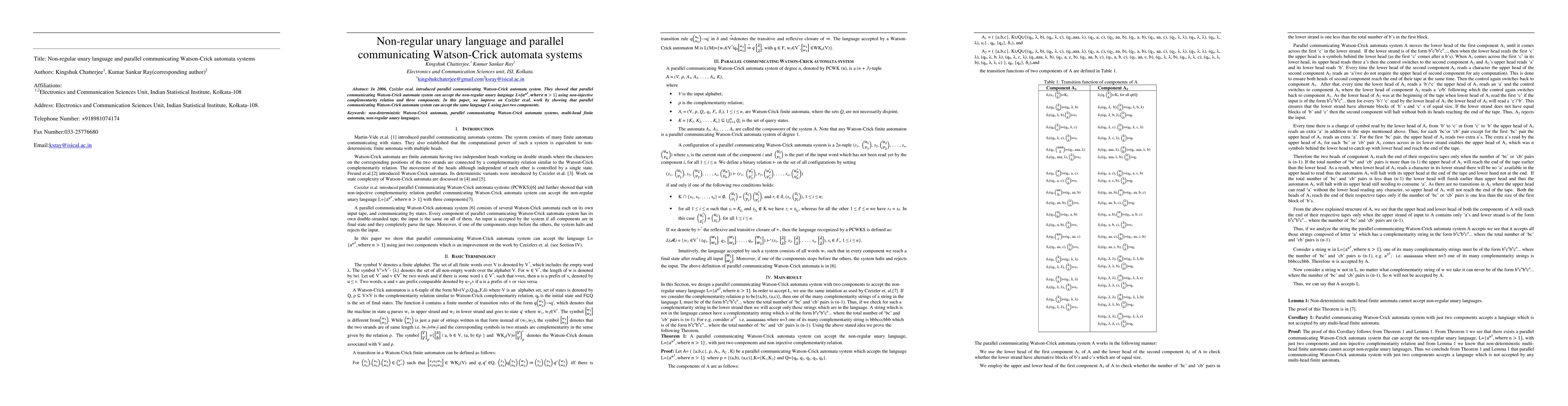 This paper improves upon Czeizler et al.'s 2006 work by demonstrating that a parallel communicating Watson-Crick automata system can accept the non-regular unary language L={a^(n^2), where n>1} using only two components, rather than the three components previously required.