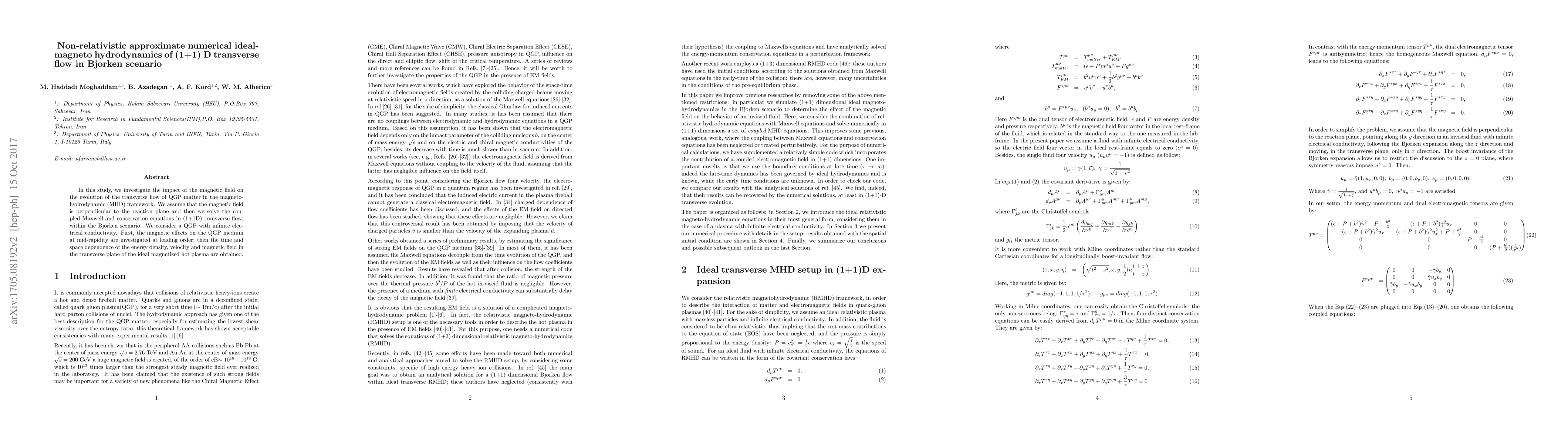 In this study, we investigate the impact of the magnetic field on the evolution of the transverse flow of QGP matter in the magneto-hydrodynamic (MHD) framework. We assume that the magnetic field is perpendicular to the reaction plane and then we solve the coupled Maxwell and conservation equations in (1+1D) transverse flow, within the Bjorken scenario. We consider a QGP with infinite electrical conductivity. First, the magnetic effects on the QGP medium at mid-rapidity are investigated at leading order; then the time and space dependence of the energy density, velocity and magnetic field in the transverse plane of the ideal magnetized hot plasma are obtained.