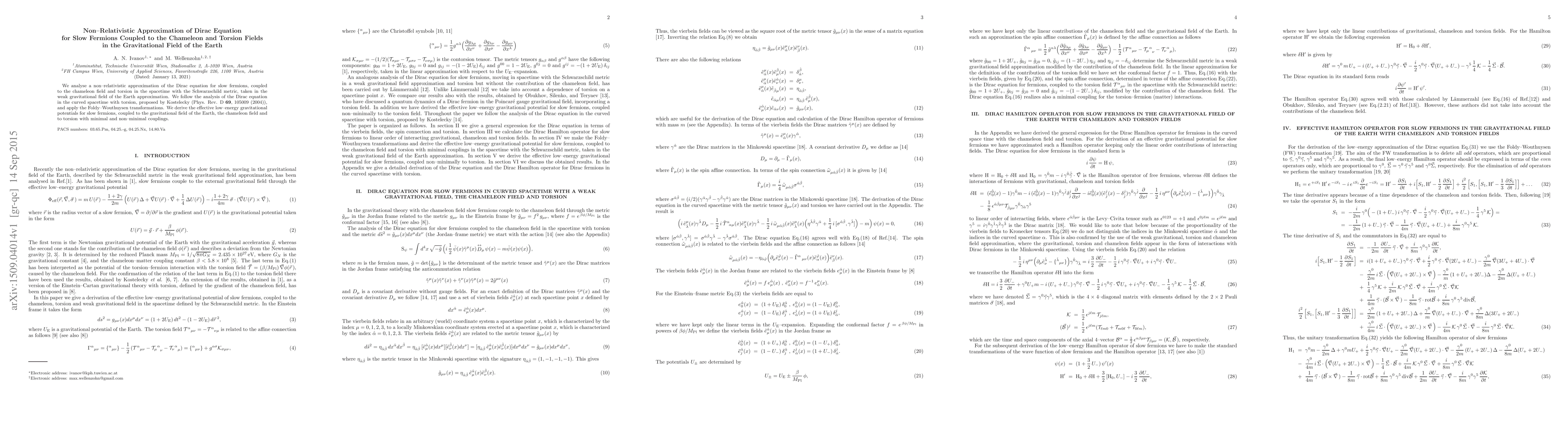 This paper derives a non-relativistic approximation of the Dirac equation for slow fermions interacting with chameleon fields and torsion in Earth's weak gravitational field. It applies Kostelecky's framework for curved spacetime with torsion and uses Foldy-Wouthuysen transformations to derive effective low-energy gravitational potentials.