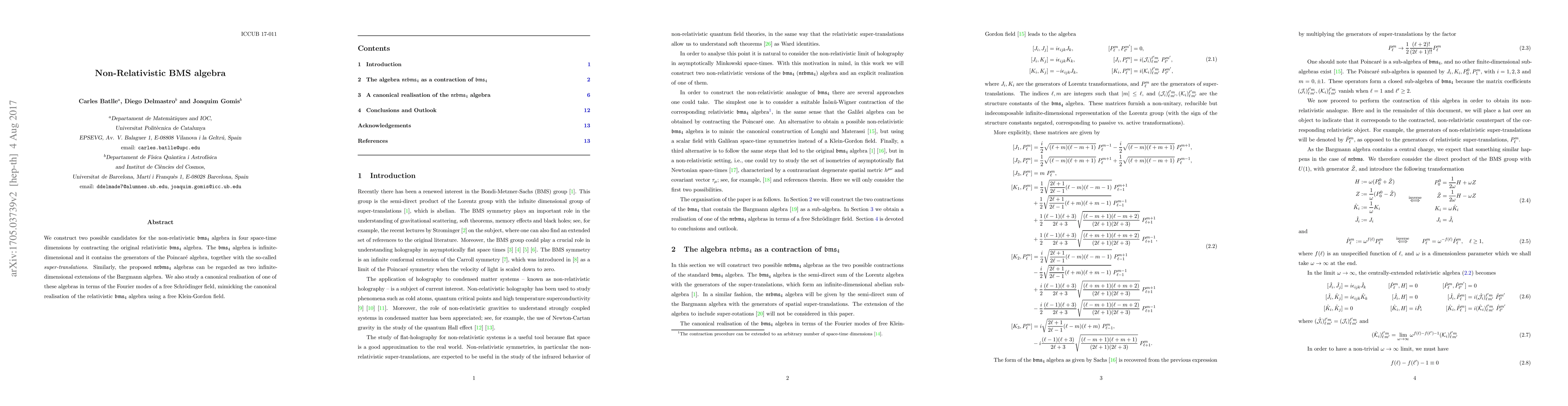 This paper constructs two non-relativistic BMS algebras by contracting the relativistic $\mathfrak{bms}_4$ algebra, which includes super-translations and Poincaré generators. It also presents a canonical realization of one of these algebras using the Fourier modes of a free Schrödinger field.