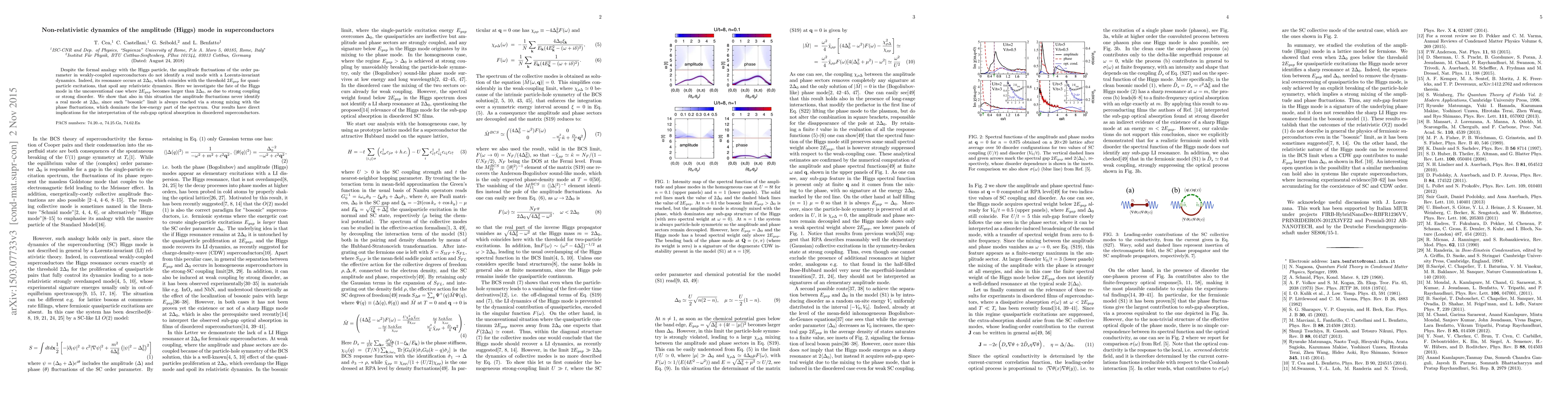 Despite the formal analogy with the Higgs particle, the amplitude fluctuations of the order parameter in weakly-coupled superconductors do not identify a real mode with a Lorentz-invariant dynamics. Indeed, its resonance occurs at $2\Delta_0$, which coincides with the threshold $2E_{gap}$ for quasiparticle excitations, that spoil any relativistic dynamics. Here we investigate the fate of the Higgs mode in the unconventional case where $2E_{gap}$ becomes larger than $2\Delta_0$, as due to strong coupling or strong disorder. We show that also in this situation the amplitude fluctuations never identify a real mode at $2\Delta_0$, since such "bosonic" limit is always reached via a strong mixing with the phase fluctuations, which dominate the low-energy part of the spectrum. Our results have direct implications for the interpretation of the sub-gap optical absorption in disordered superconductors.