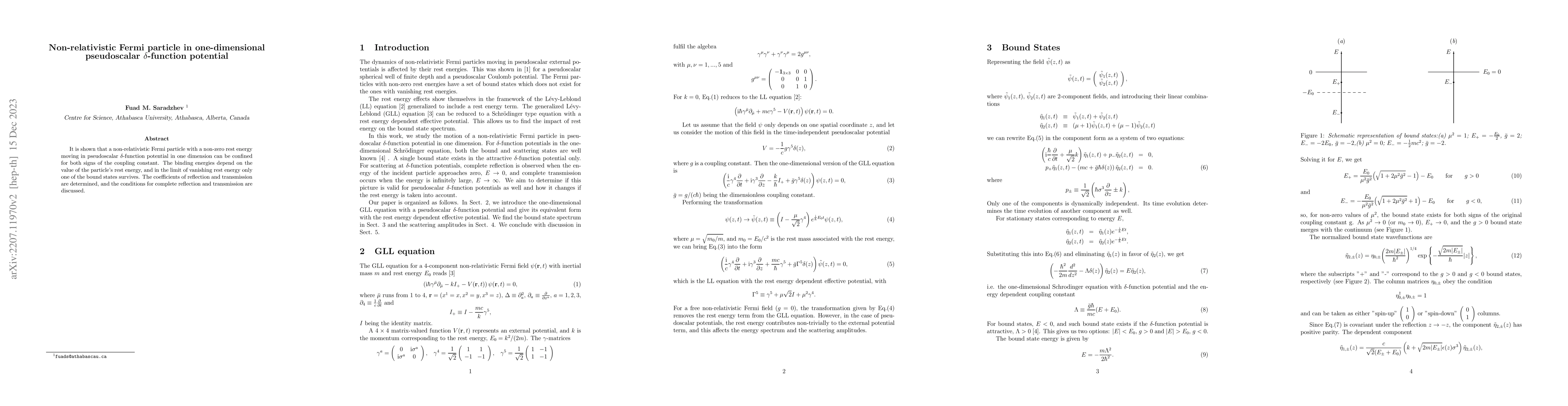 This paper demonstrates that a non-relativistic Fermi particle in a one-dimensional pseudoscalar δ-function potential can be confined regardless of the coupling constant's sign, with binding energies varying with the particle's rest energy. It also explores the reflection and transmission coefficients, and conditions for complete reflection and transmission.