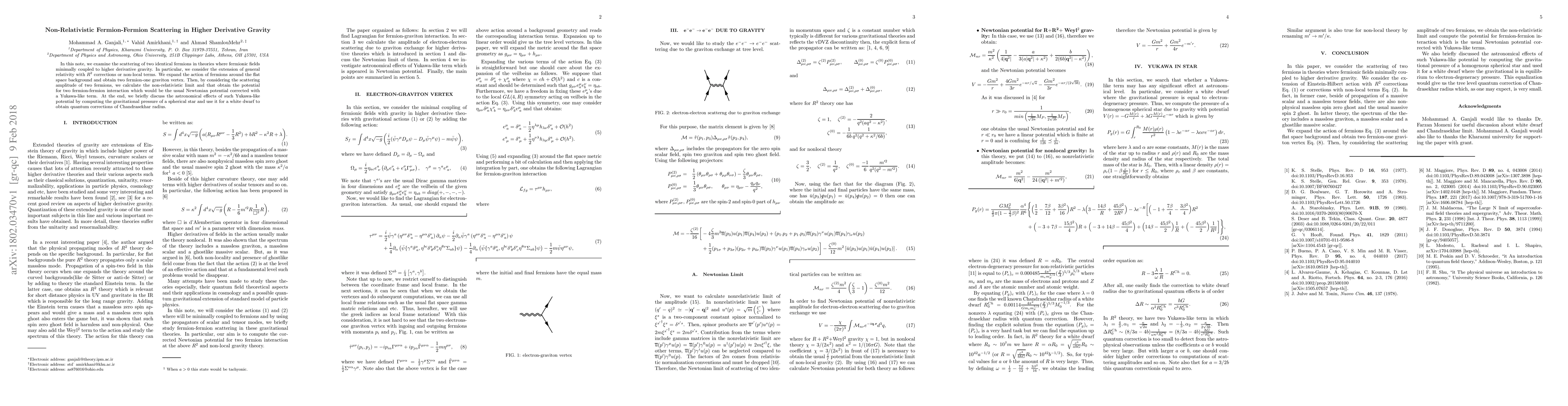 In this note, we examine the scattering of two identical fermions in theories where fermionic fields minimally coupled to higher derivative gravity. In particular, we consider the extension of general relativity with $R^2$ corrections or non-local terms. We expand the action of fermions around the flat space background and obtain two fermion-one graviton vertex. Then, by considering the scattering amplitude of two fermions, we calculate the non-relativistic limit and that obtain the potential for two fermion-fermion interaction which would be the usual Newtonian potential corrected with a Yukawa-like term. At the end, we briefly discuss the astronomical effects of such Yukawa-like potential by computing the gravitational pressure of a spherical star and use it for a white dwarf to obtain quantum corrections of Chandrasekhar radius.
