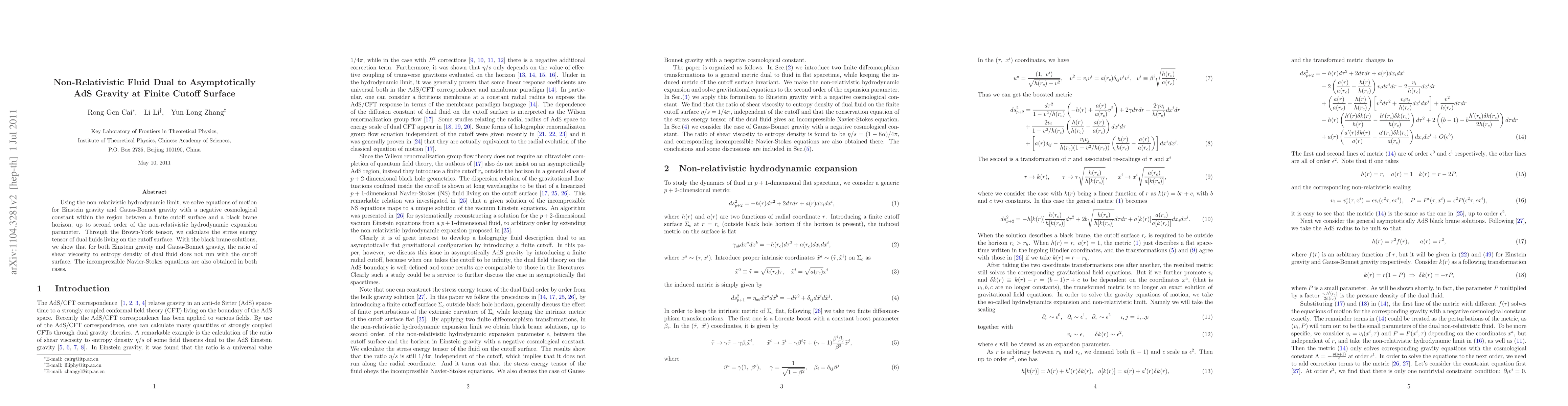 This paper solves the equations of motion for non-relativistic fluids in asymptotically AdS gravity, showing that the ratio of shear viscosity to entropy density for dual fluids remains constant with respect to a finite cutoff surface. The incompressible Navier-Stokes equations are derived for both Einstein and Gauss-Bonnet gravity.