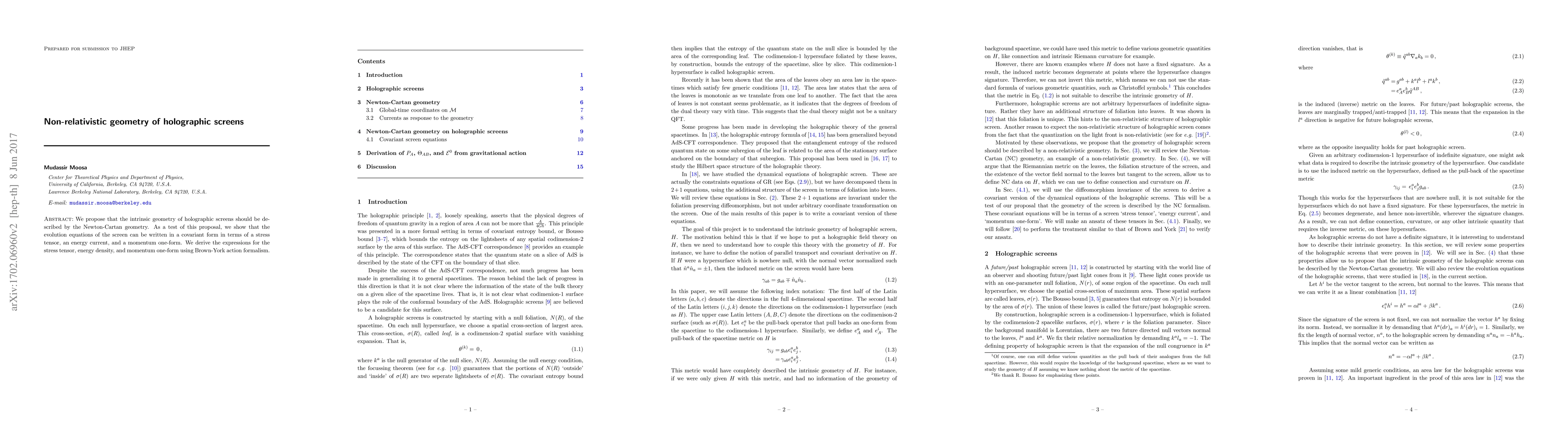 Researchers propose using Newton-Cartan geometry to describe holographic screens, deriving equations for stress tensor, energy density, and momentum one-form using Brown-York action formalism.