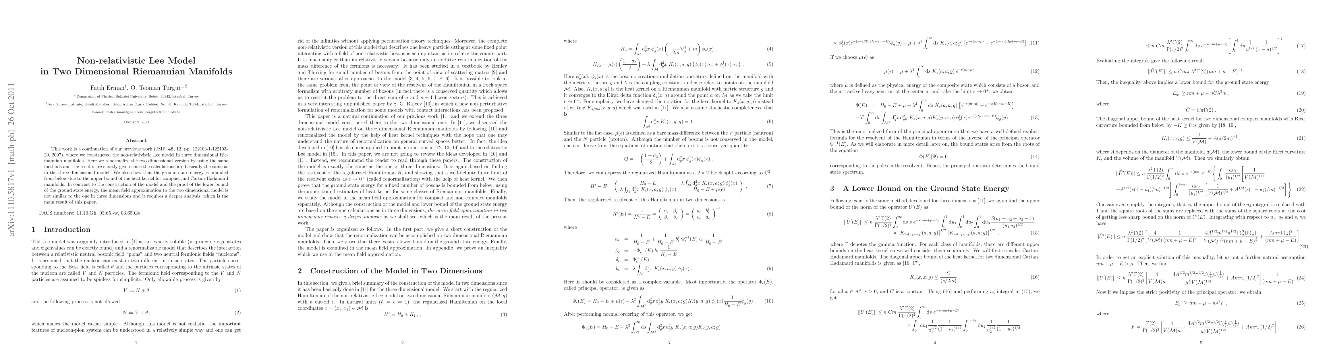 This paper extends the non-relativistic Lee model to two-dimensional Riemannian manifolds, employing renormalization techniques similar to those used in a three-dimensional context. It demonstrates that the ground state energy is bounded below, contrasting the mean field approximation in two dimensions, which requires a more in-depth analysis compared to its three-dimensional counterpart.
