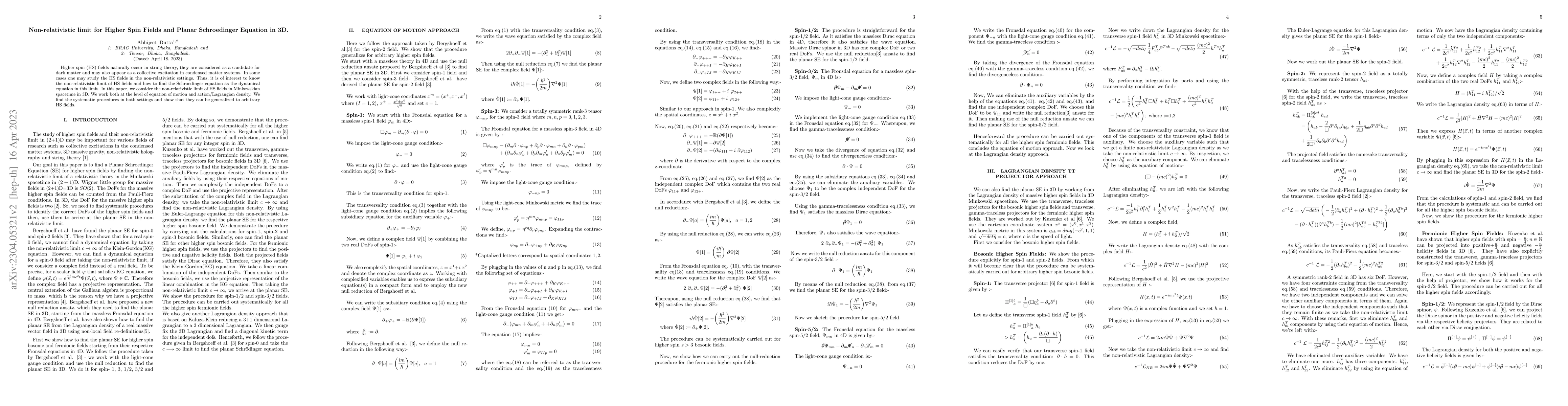 This paper investigates the non-relativistic limit of higher spin fields in 3D Minkowskian spacetime, deriving the corresponding planar Schrödinger equation. It systematically explores both the equation of motion and the Lagrangian density, demonstrating generalizability to any higher spin field.