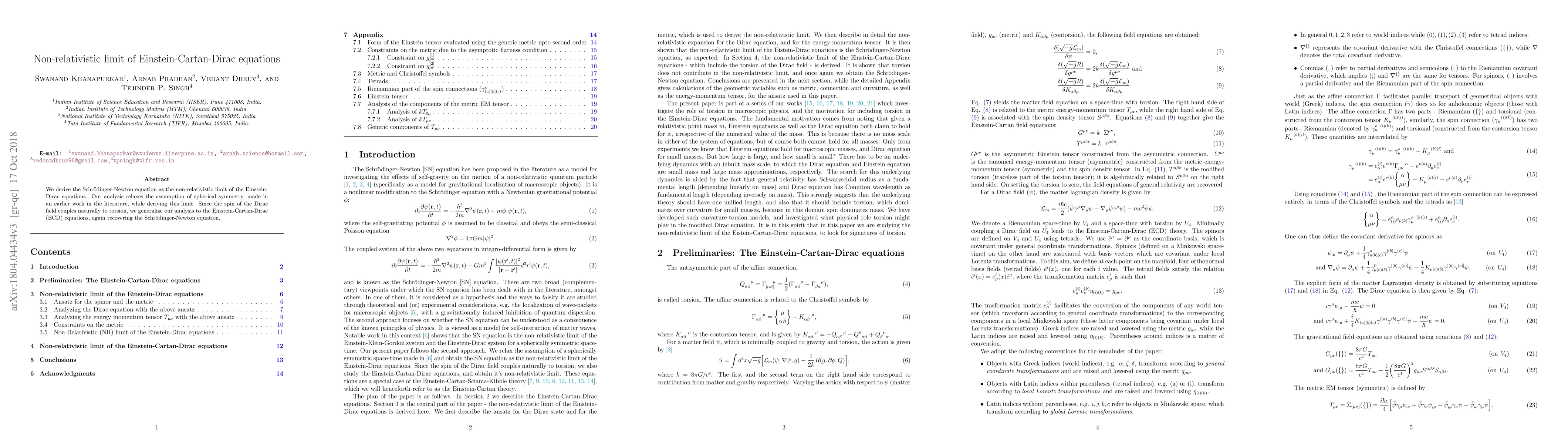 This paper derives the Schrödinger-Newton equation from the non-relativistic limit of the Einstein-Cartan-Dirac (ECD) equations, without assuming spherical symmetry. The study highlights the natural coupling of the Dirac field's spin to torsion in the ECD framework.