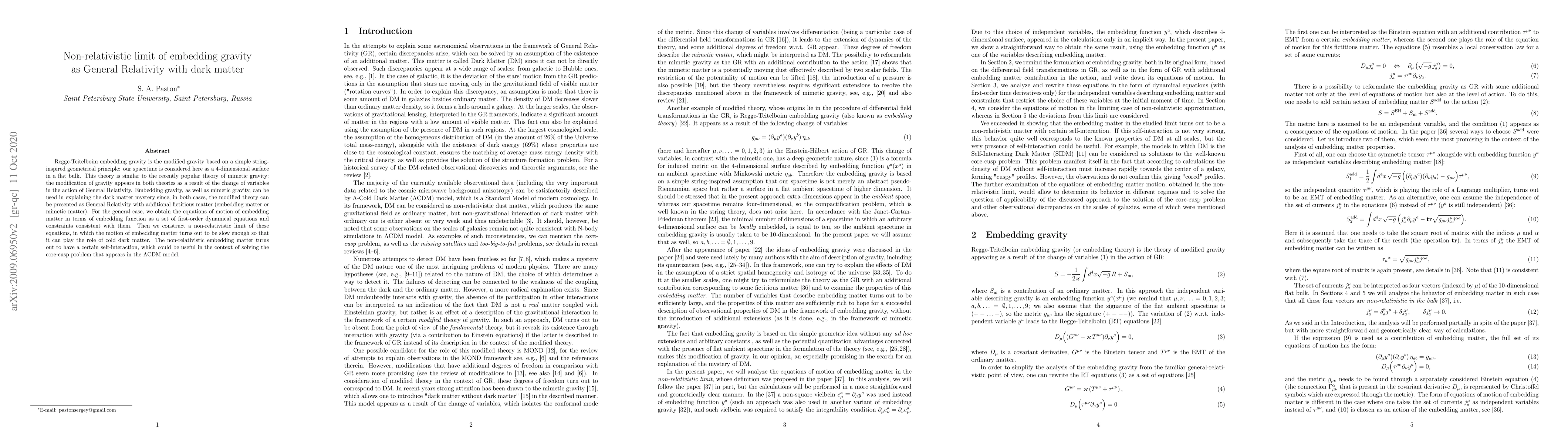 Regge-Teitelboim embedding gravity is the modified gravity based on a simple string-inspired geometrical principle: our spacetime is considered here as a 4-dimensional surface in a flat bulk. This theory is similar to the recently popular theory of mimetic gravity: the modification of gravity appears in both theories as a result of the change of variables in the action of General Relativity. Embedding gravity, as well as mimetic gravity, can be used in explaining the dark matter mystery since, in both cases, the modified theory can be presented as General Relativity with additional fictitious matter (embedding matter or mimetic matter). For the general case, we obtain the equations of motion of embedding matter in terms of embedding function as a set of first-order dynamical equations and constraints consistent with them. Then we construct a non-relativistic limit of these equations, in which the motion of embedding matter turns out to be slow enough so that it can play the role of cold dark matter. The non-relativistic embedding matter turns out to have a certain self-interaction, which could be useful in the context of solving the core-cusp problem that appears in the LambdaCDM model.