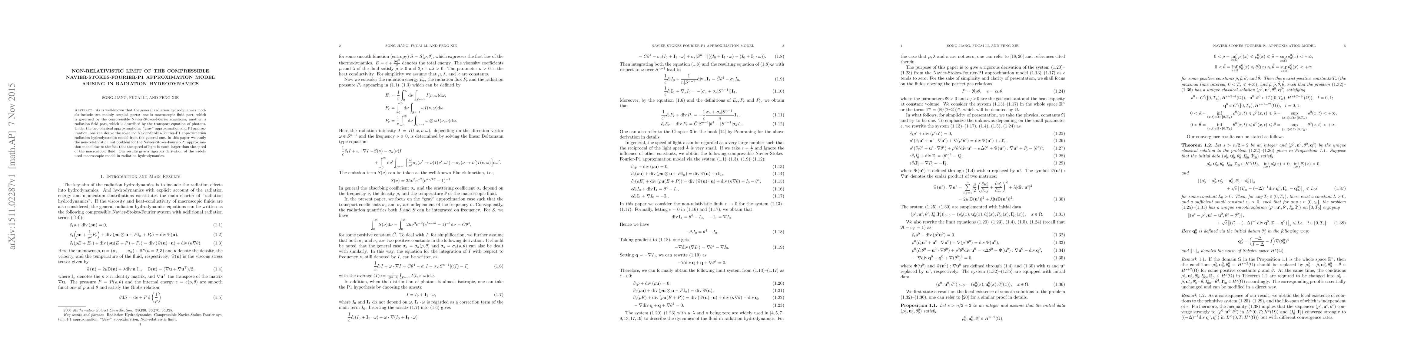 This paper investigates the non-relativistic limit of the Navier-Stokes-Fourier-P1 approximation model in radiation hydrodynamics, deriving a rigorous macroscopic model by simplifying the general radiation hydrodynamics equations under the "gray" and P1 approximations. The study focuses on scenarios where the speed of light vastly exceeds the fluid's speed.