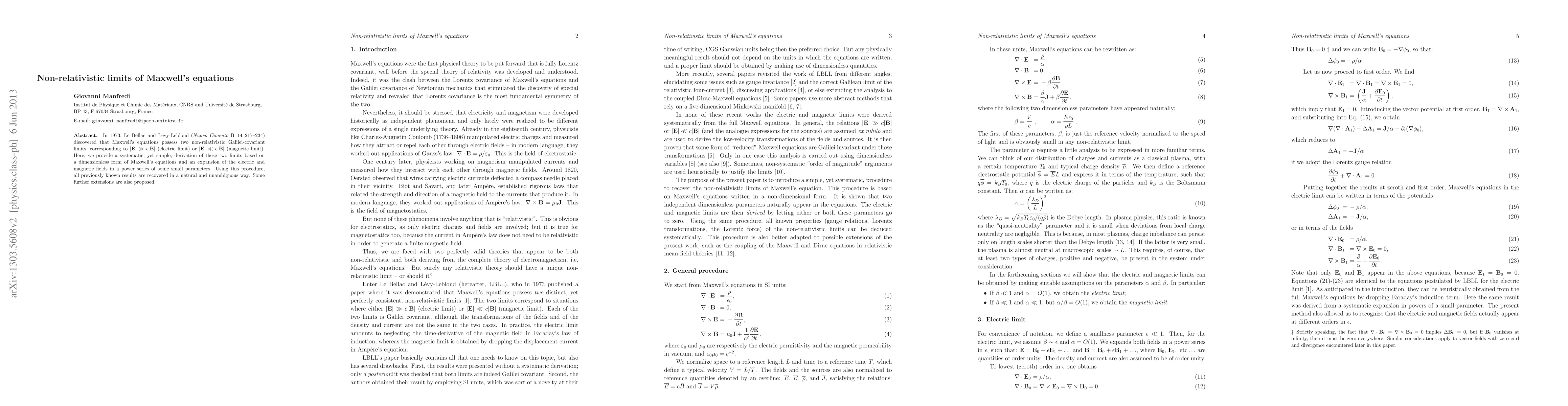 This paper systematically derives the two non-relativistic limits of Maxwell's equations—the electric and magnetic limits—using a dimensionless form and field expansions. It recovers previous findings and proposes further extensions.
