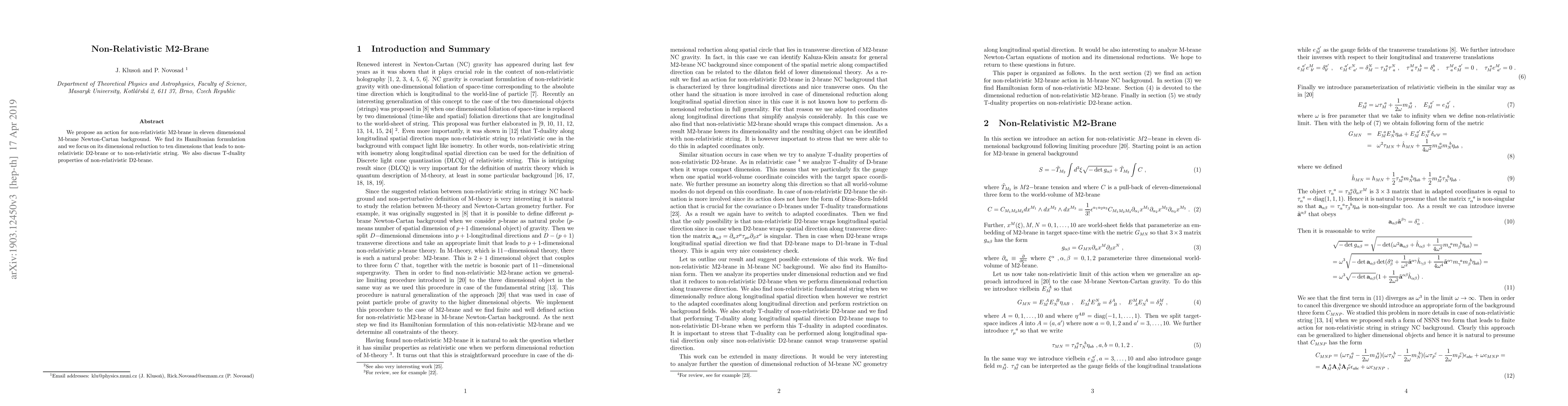 The paper proposes an action for a non-relativistic M2-brane in an eleven-dimensional Newton-Cartan background and examines its Hamiltonian formulation. It explores dimensional reduction to ten dimensions, yielding either a non-relativistic D2-brane or a non-relativistic string, and discusses T-duality properties of the D2-brane.