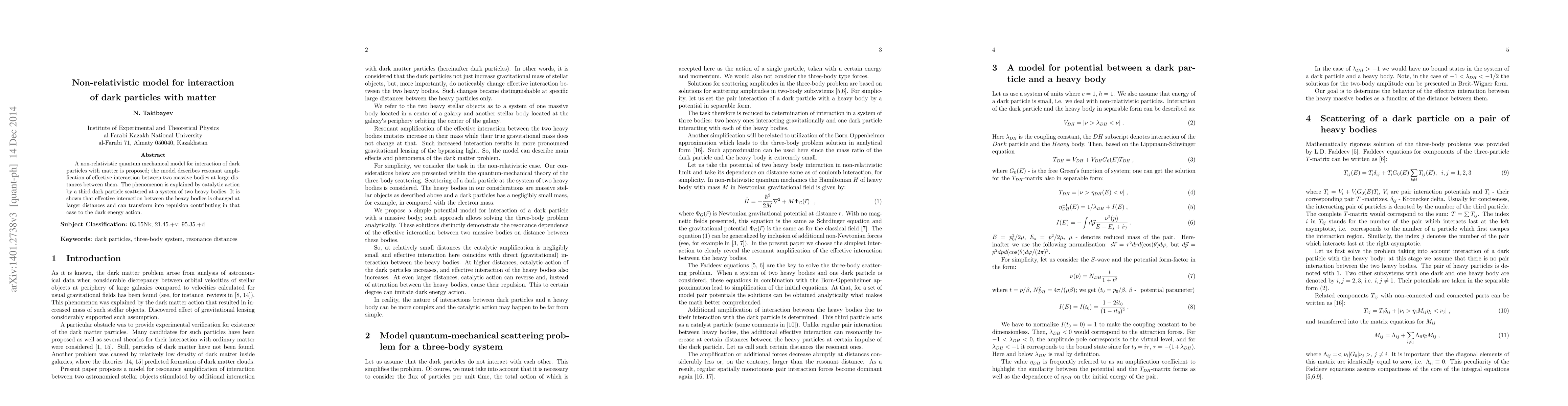 This paper proposes a non-relativistic quantum mechanical model for dark particles interacting with matter, explaining resonant amplification of effective interaction between massive bodies through catalytic action by a third dark particle, which can lead to repulsive forces at large distances contributing to dark energy.