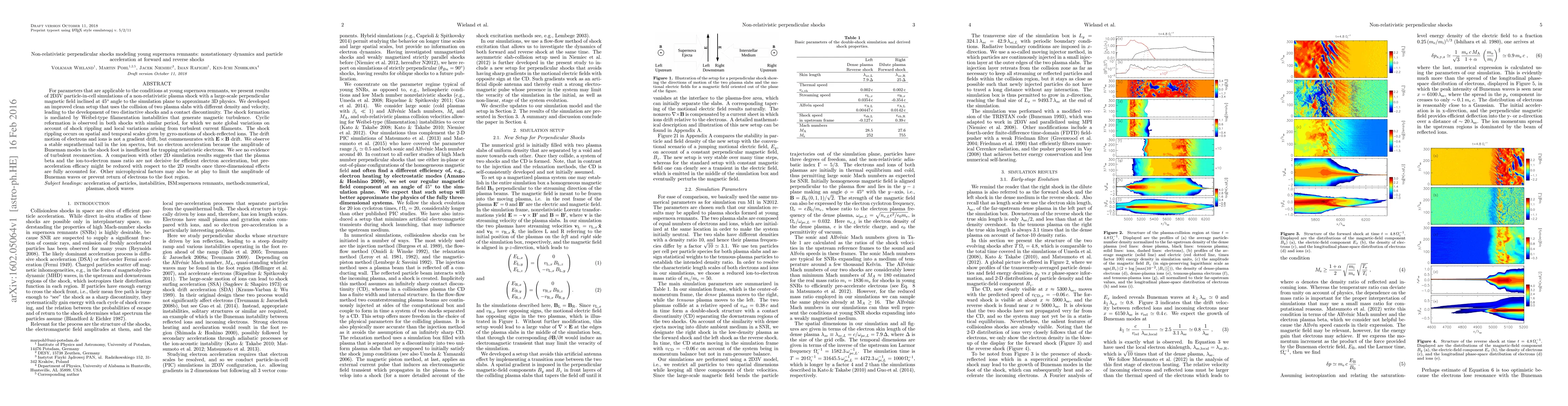This study models young supernova remnants using 2D3V particle-in-cell simulations to understand non-relativistic perpendicular shock dynamics and particle acceleration, including stable suprathermal ion tails but no electron acceleration.