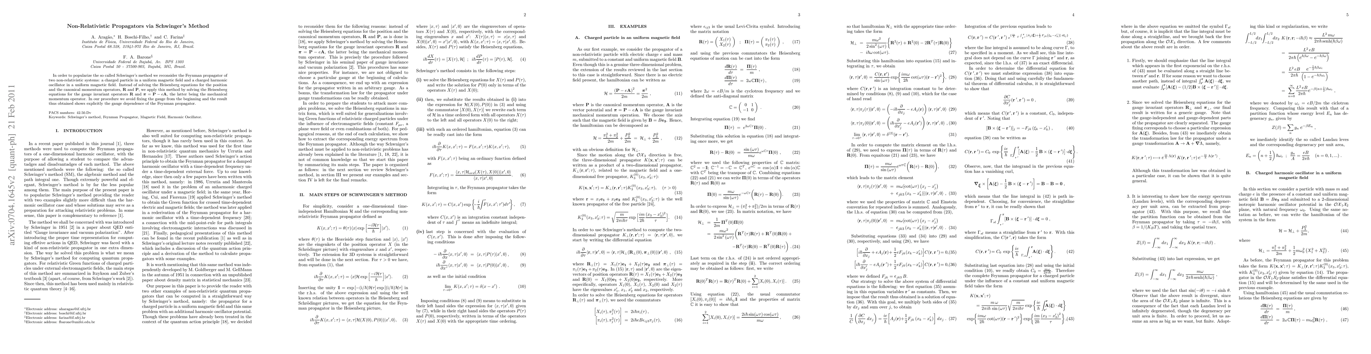 This paper explores Schwinger's method to derive non-relativistic propagators for charged particles in magnetic fields, specifically for a particle in a uniform magnetic field and a charged harmonic oscillator. It avoids fixing the gauge initially, revealing the gauge dependence of the Feynman propagator.