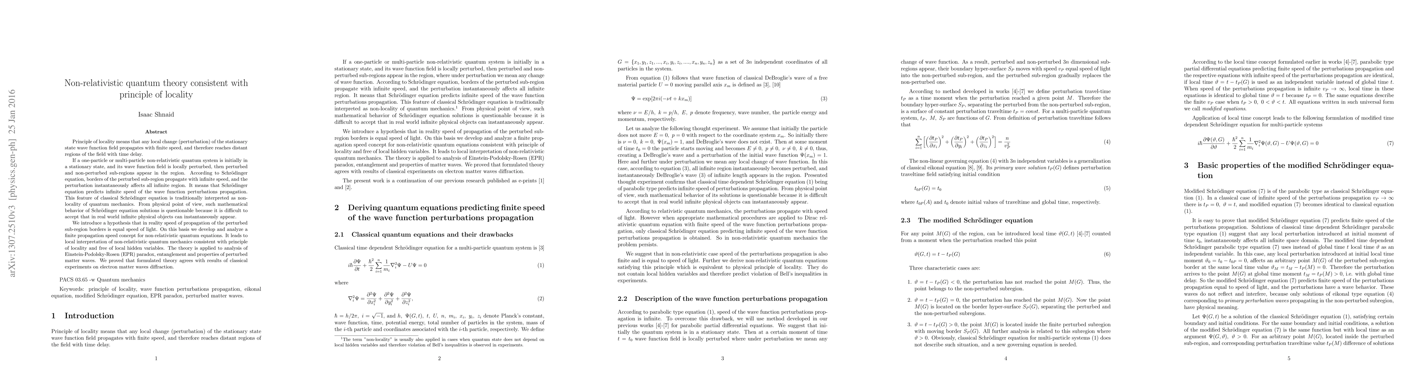 This paper proposes a non-relativistic quantum theory that adheres to the principle of locality by introducing a finite speed of propagation for wave function perturbations, resolving the issue of instantaneous effects predicted by the Schrödinger equation. The developed theory is applied to the Einstein-Podolsky-Rosen paradox and agrees with classical experiments on electron diffraction.