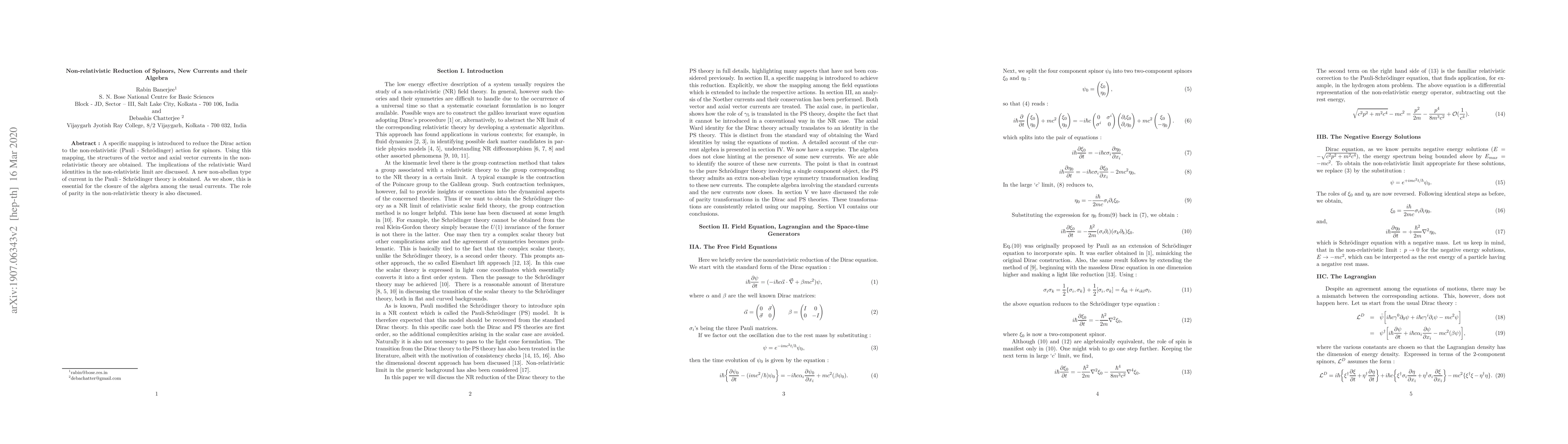 This paper introduces a mapping to reduce the Dirac action to the non-relativistic Pauli-Schrödinger action for spinors, revealing new vector and axial vector currents. It also uncovers a new non-abelian current crucial for the closure of the algebra among usual currents, while discussing the implications of relativistic Ward identities and the role of parity in the non-relativistic framework.