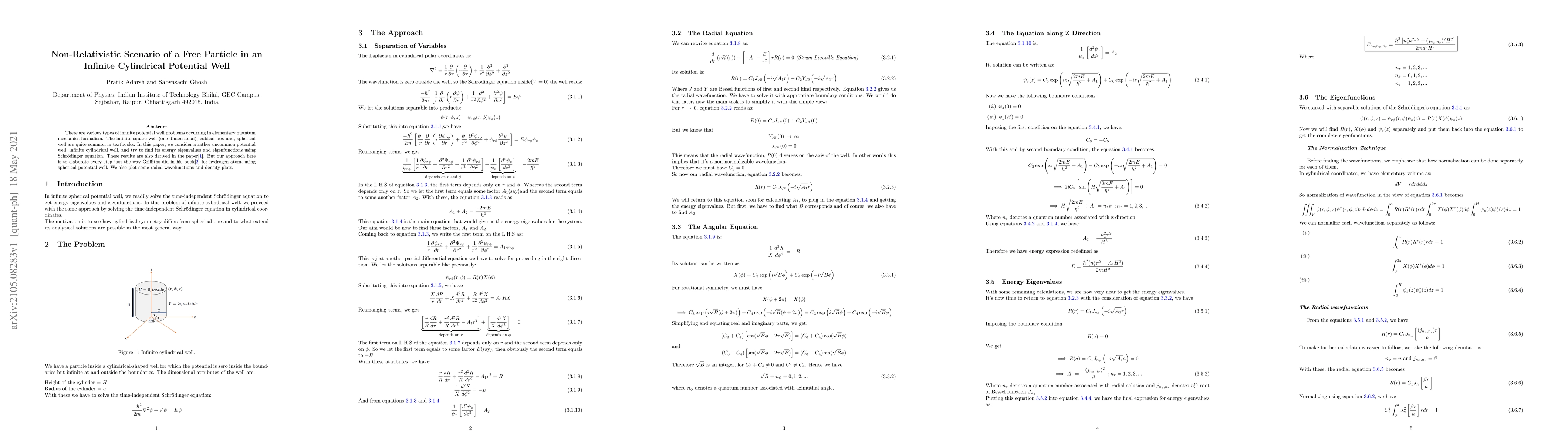 There are various types of infinite potential well problems occurring in elementary quantum mechanics formalism. The infinite square well (one dimensional), cubical box and, spherical well are quite common in textbooks. In this paper, we consider a rather uncommon potential well, an infinite cylindrical well, and try to find its energy eigenvalues and eigenfunctions using Schr\"{o}dinger equation. We also plot some radial wavefunctions and density plots.