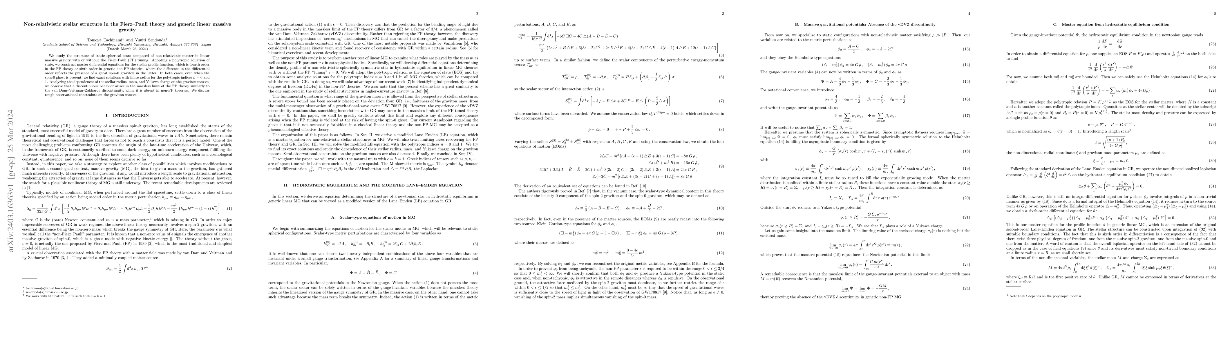We study the structure of static spherical stars composed of non-relativistic matter in linear massive gravity with or without the Fierz-Pauli (FP) tuning. Adopting a polytropic equation of state, we construct master differential equations for the stellar profile function, which is fourth order in the FP theory or sixth order in generic non-FP theories, where the difference in the differential order reflects the presence of a ghost spin-0 graviton in the latter. In both cases, even when the spin-0 ghost is present, we find exact solutions with finite radius for the polytropic indices n = 0 and 1. Analyzing the dependences of the stellar radius, mass, and Yukawa charge on the graviton masses, we observe that a discontinuous behavior arises in the massless limit of the FP theory similarly to the van Dam-Veltman-Zakharov discontinuity, while it is absent in non-FP theories. We discuss rough observational constraints on the graviton masses.