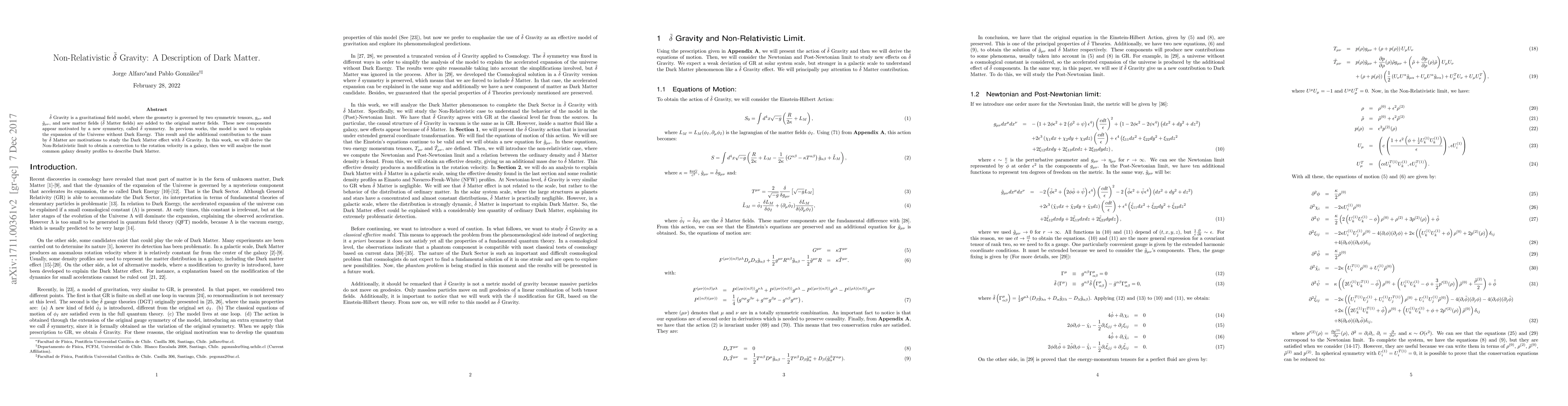 $\tilde{\delta}$ Gravity is a gravitational field model, where the geometry is governed by two symmetric tensors, $g_{\mu \nu}$ and $\tilde{g}_{\mu \nu}$, and new matter fields ($\tilde{\delta}$ Matter fields) are added to the original matter fields. These new components appear motivated by a new symmetry, called $\tilde{\delta}$ symmetry. In previous works, the model is used to explain the expansion of the Universe without Dark Energy. This result and the additional contribution to the mass by $\tilde{\delta}$ Matter are motivations to study the Dark Matter effect with $\tilde{\delta}$ Gravity. In this work, we will derive the Non-Relativistic limit to obtain a correction to the rotation velocity in a galaxy, then we will analyze the most common galaxy density profiles to describe Dark Matter.