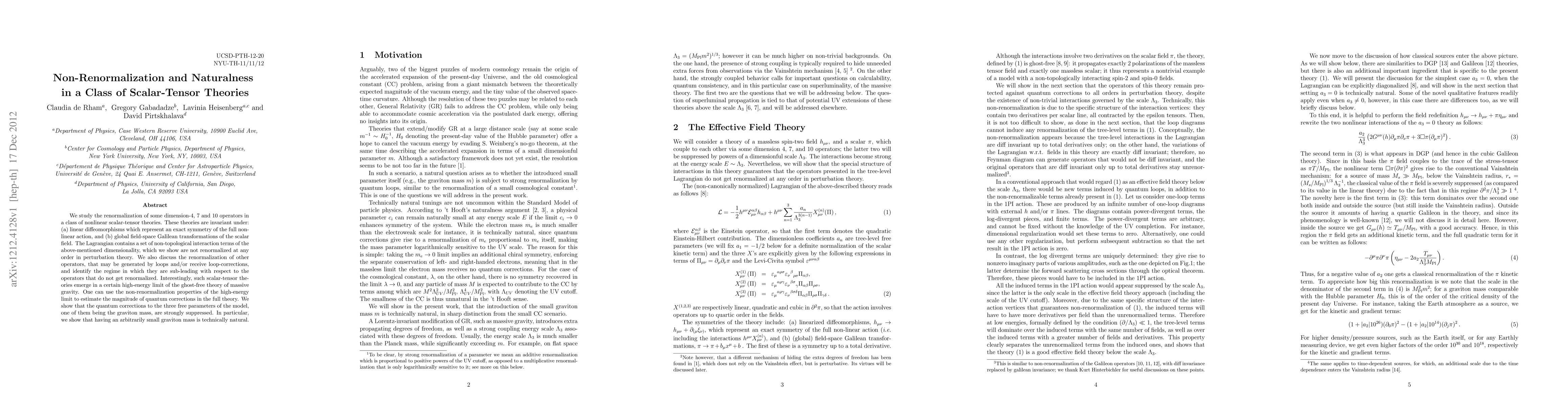 This paper investigates the non-renormalization of certain dimension-4, 7, and 10 operators in nonlinear scalar-tensor theories, demonstrating that these operators remain unchanged at any order in perturbation theory. The study also highlights the technical naturalness of small graviton masses in these theories, which emerge in a high-energy limit of ghost-free massive gravity.