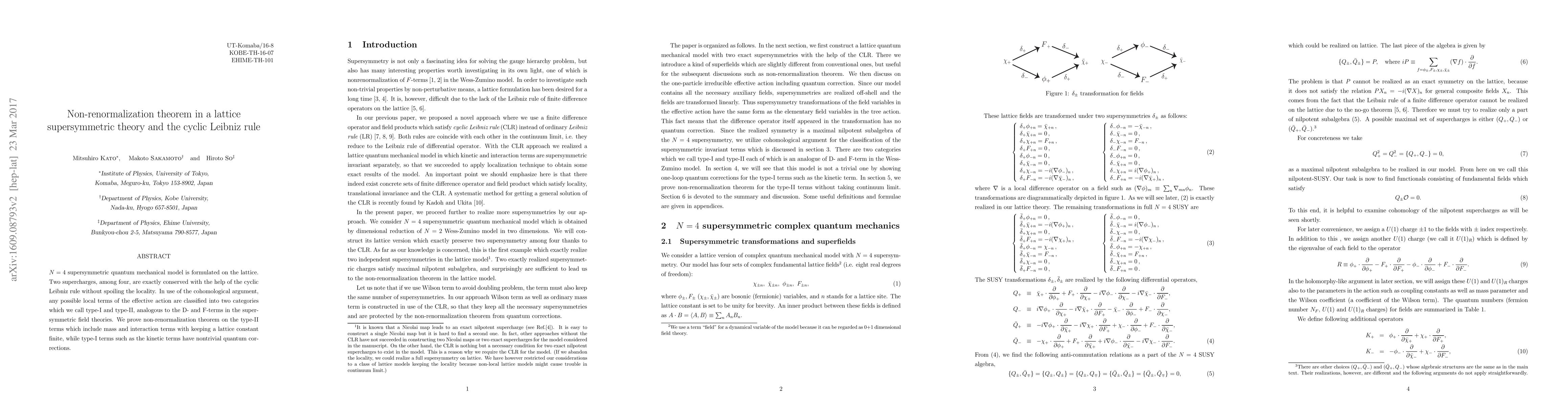 Summary: This paper formulates an N=4 supersymmetric quantum mechanical model on a lattice, conserving two supercharges using the cyclic Leibniz rule. It classifies local terms in the effective action into type-I and type-II, proving a non-renormalization theorem for type-II terms, which includes mass and interaction terms, while type-I terms experience quantum corrections.