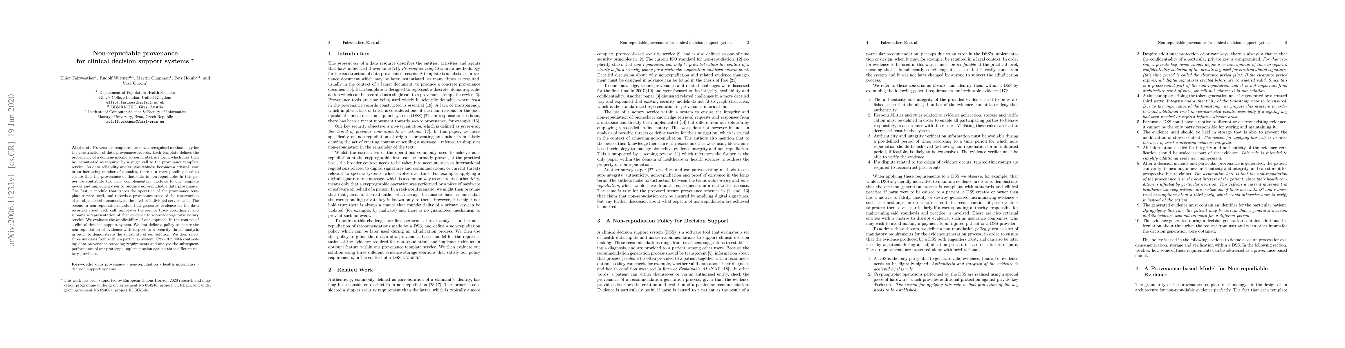 This paper introduces two modules to enhance a template-based model for non-repudiable data provenance in clinical decision support systems, ensuring data reliability and trustworthiness. The modules trace service operations and generate evidence for data calls, submitting them to a notary service for verification. The approach is evaluated through use cases in a clinical system, demonstrating its effectiveness.